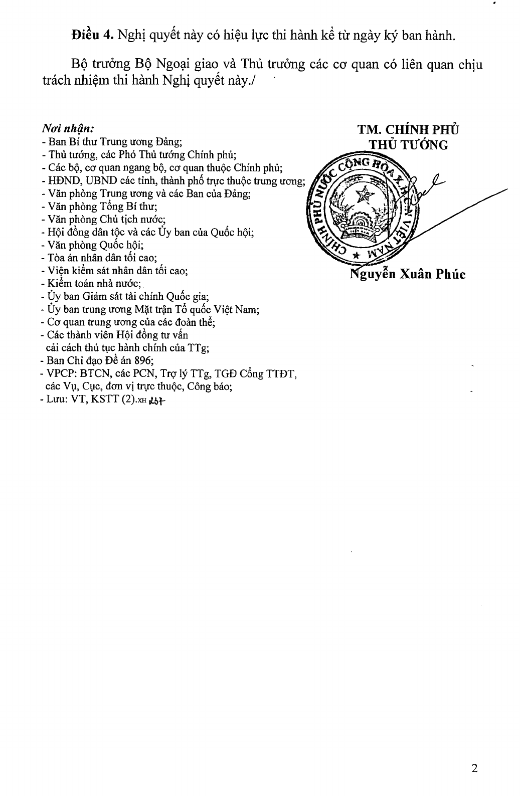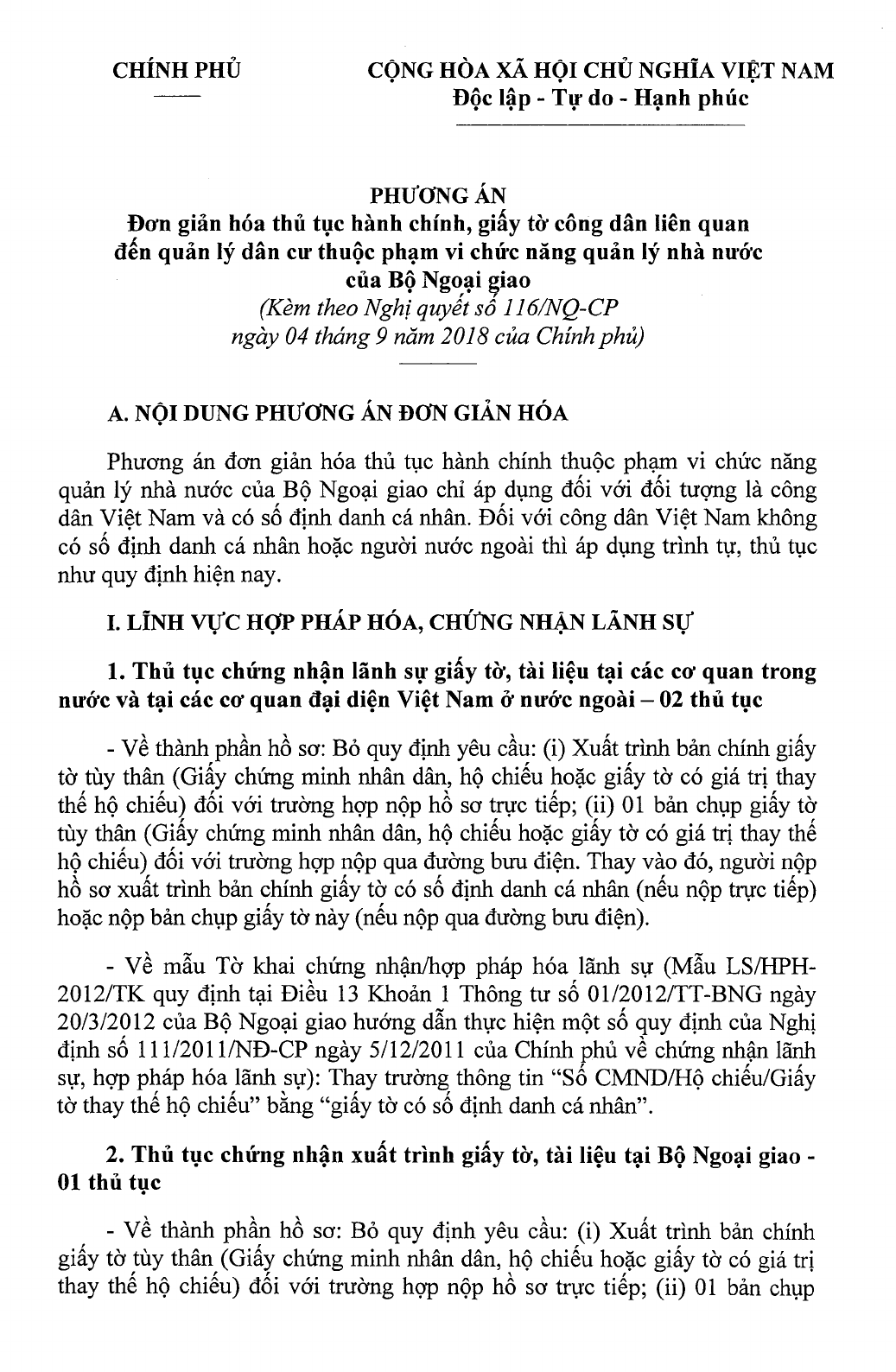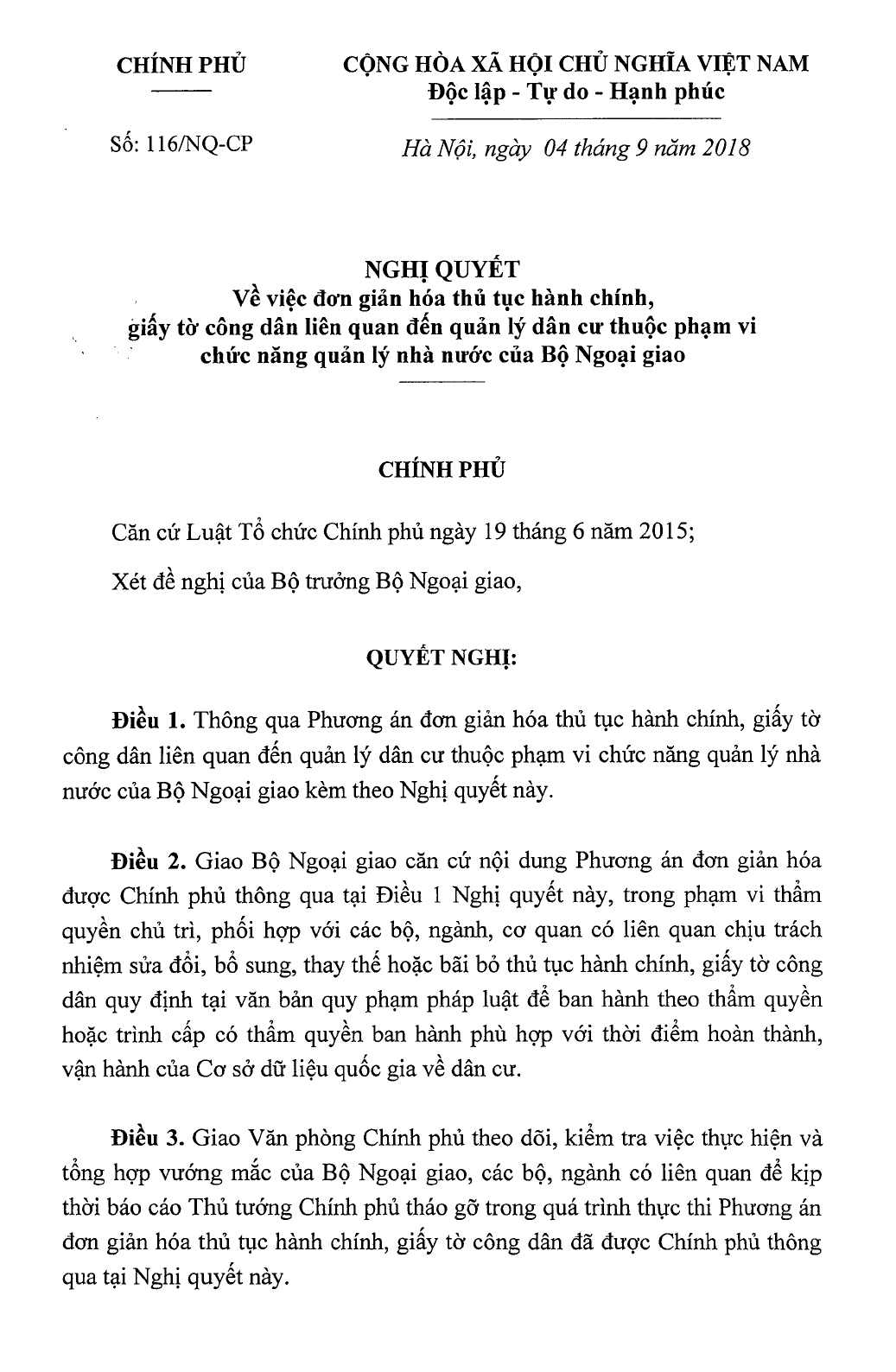 Nghị quyết 116/NQ-CP năm 2018 về đơn giản hóa thủ tục hành chính, giấy tờ công dân liên quan đến quản lý dân cư thuộc phạm vi chức năng quản lý nhà nước của bộ ngoại giao do chính phủ ban hành.