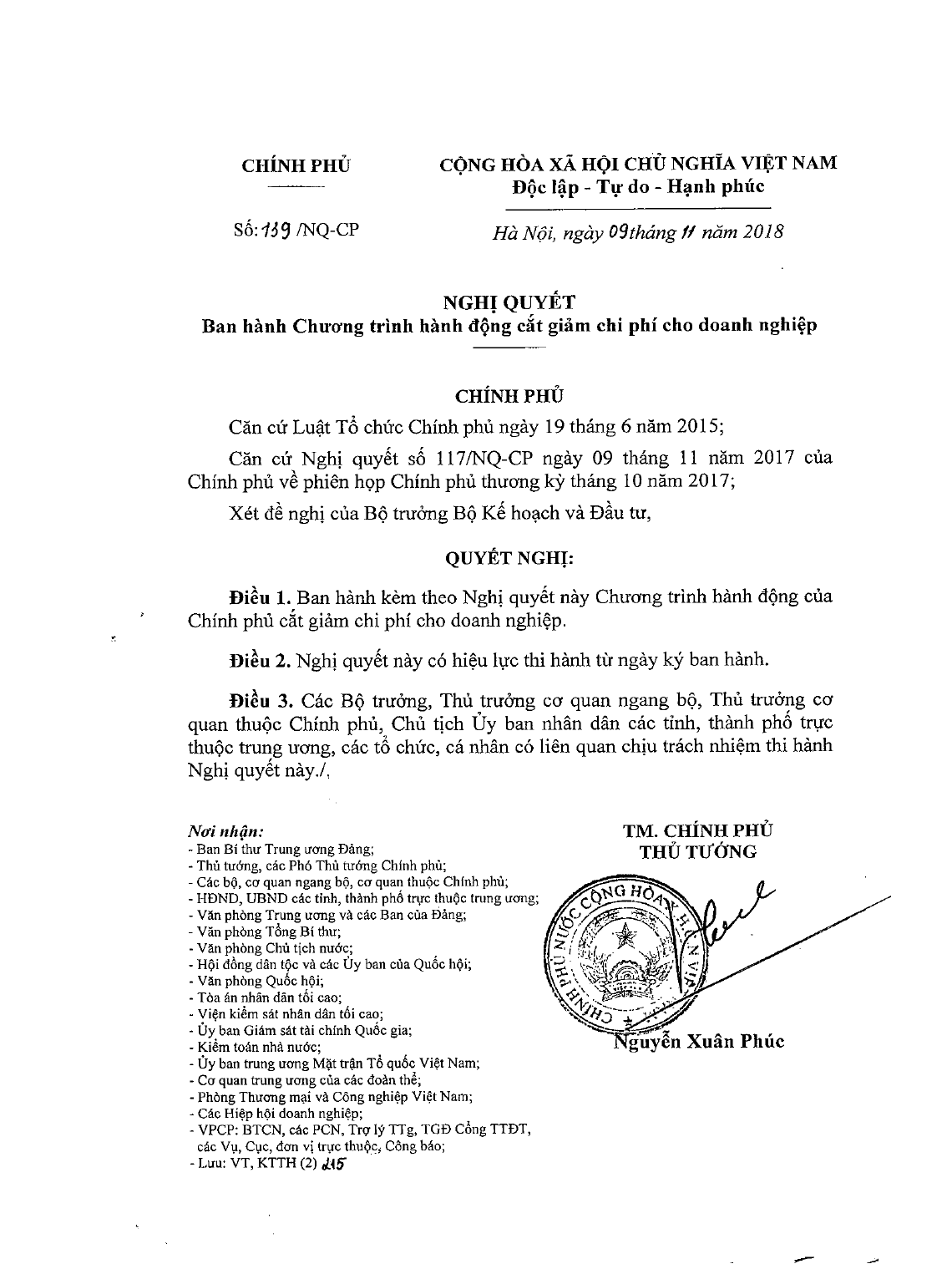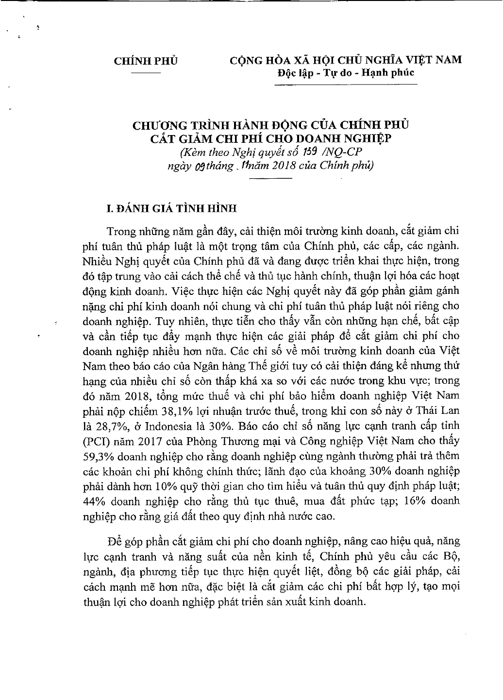 Nghị quyết 139/NQ-CP năm 2018 về chương trình hành động cắt giảm chi phí cho doanh nghiệp do Chính phủ ban hành.