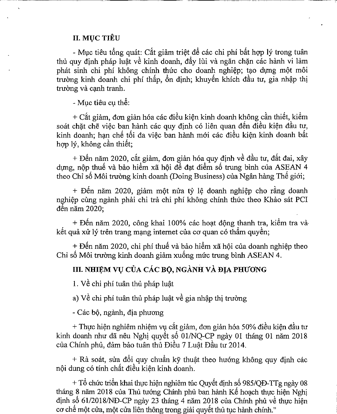 Theo đó, Chính phủ yêu cầu các Bộ, ngành, địa phương thực hiện quyết liệt, đồng bộ các cải cách, đặc biệt cắt giảm các chi phí bất hợp lý, đơn cử như việc đơn giản hóa mẫu biểu, tờ khai về đăng ký doanh nghiệp, giảm thành phần giấy tờ trong hồ sơ đăng ký thay đổi nội dung đăng ký doanh nghiệp.