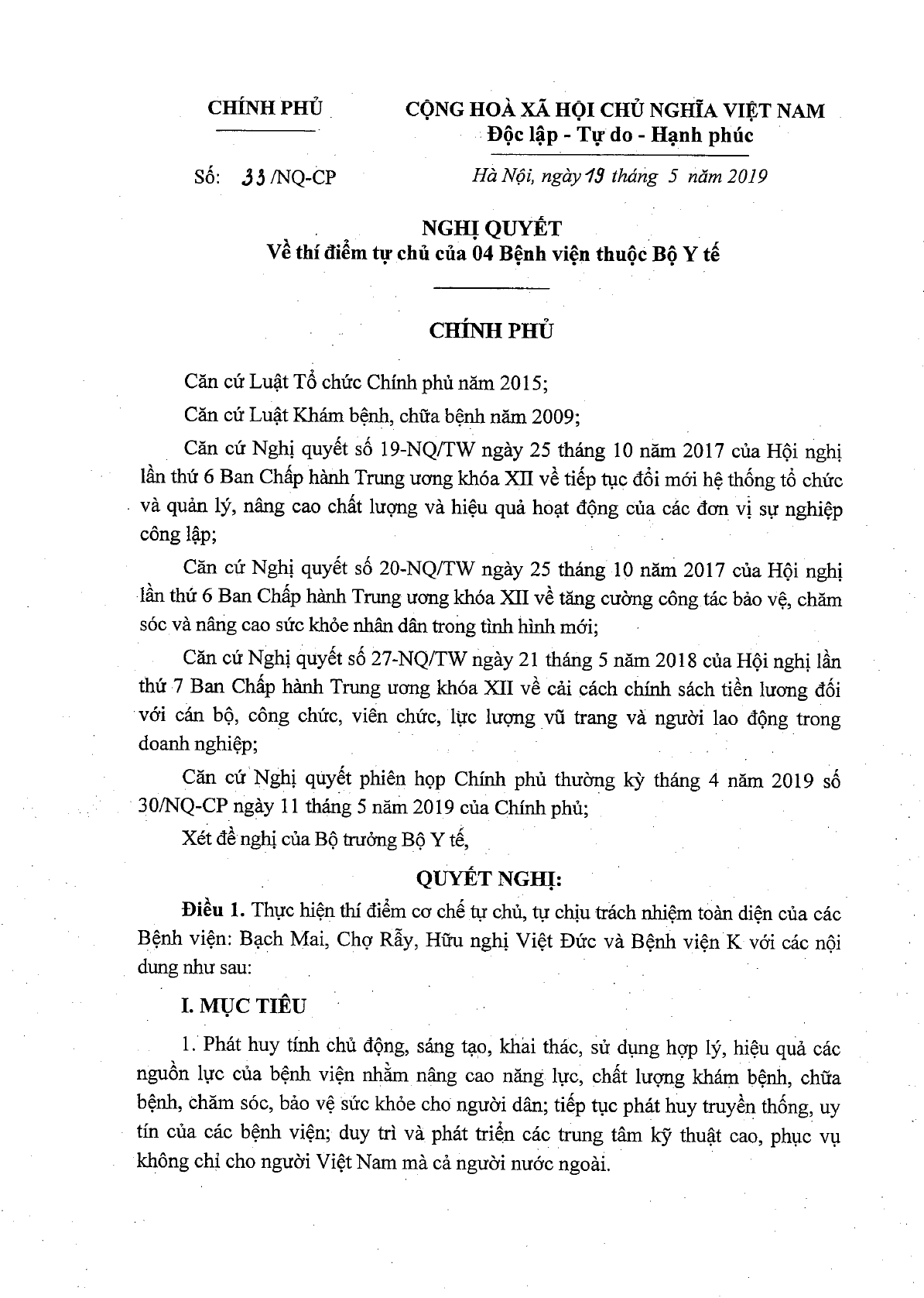 Chính phủ đã ban hành Nghị quyết 33/NQ-CP về việc thí điểm tự chủ của 04 Bệnh viện thuộc Bộ Y tế ngày 19/05/2019.