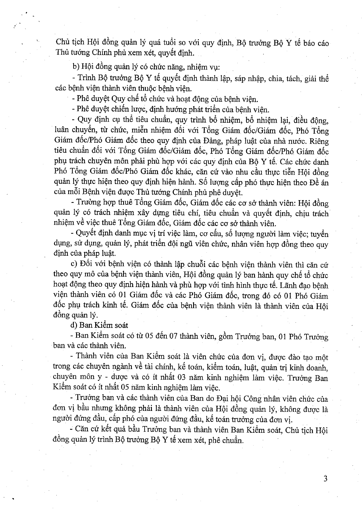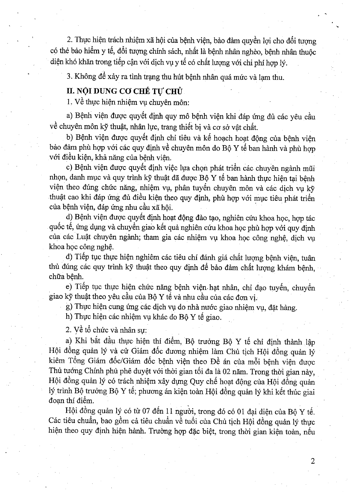 Thứ hai, về tổ chức và nhân sự, khi bắt đầu thực hiện thí điểm, Bộ trưởng Bộ Y tế chỉ định thành lập Hội đồng quản lý và cử Giám đốc đương nhiệm làm Chủ tịch Hội đồng quản lý kiêm Tổng Giám đốc/Giám đốc bệnh viện theo Đề án của mỗi bệnh viện được Thủ tướng phê duyệt với thời gian tối đa là 02 năm.