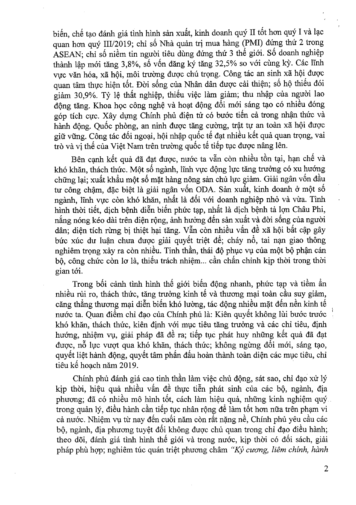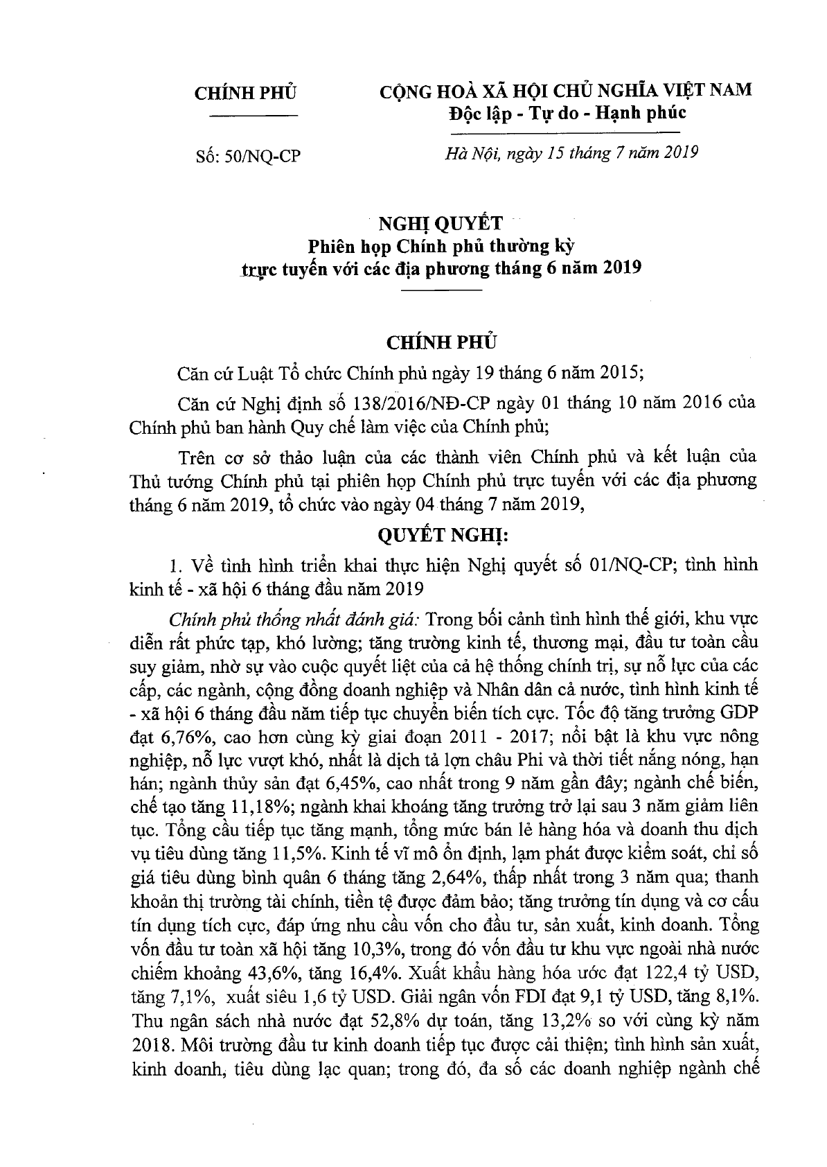 Ngày 15/7/2019, Chính phủ đã ban hành Nghị quyết 50/NQ-CP về phiên họp Chính phủ thường kỳ trực tuyến với các địa phương tháng 6 năm 2019.