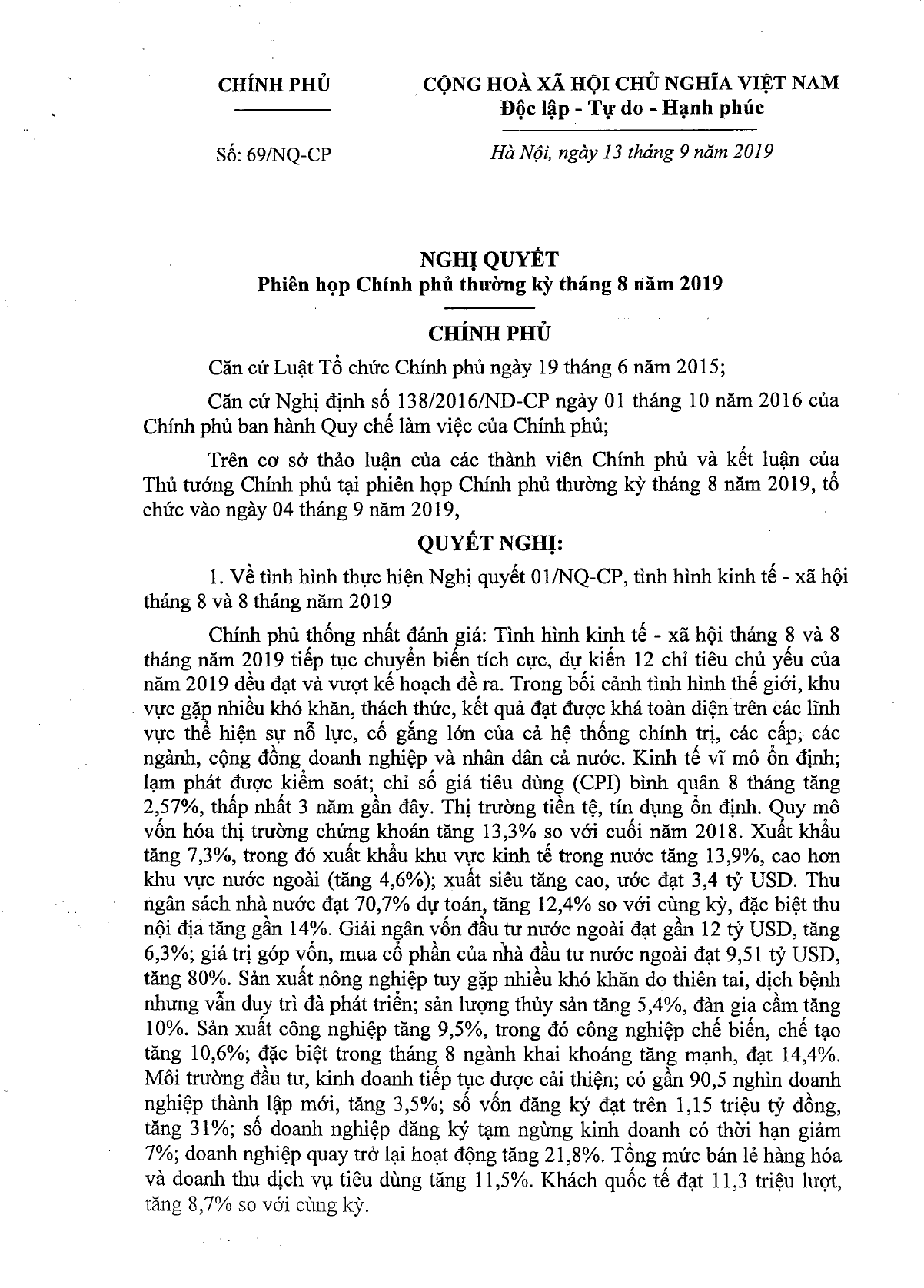Nghị quyết 69/NQ-CP của Chính phủ về phiên họp Chính phủ thường kỳ tháng 8 năm 2019.