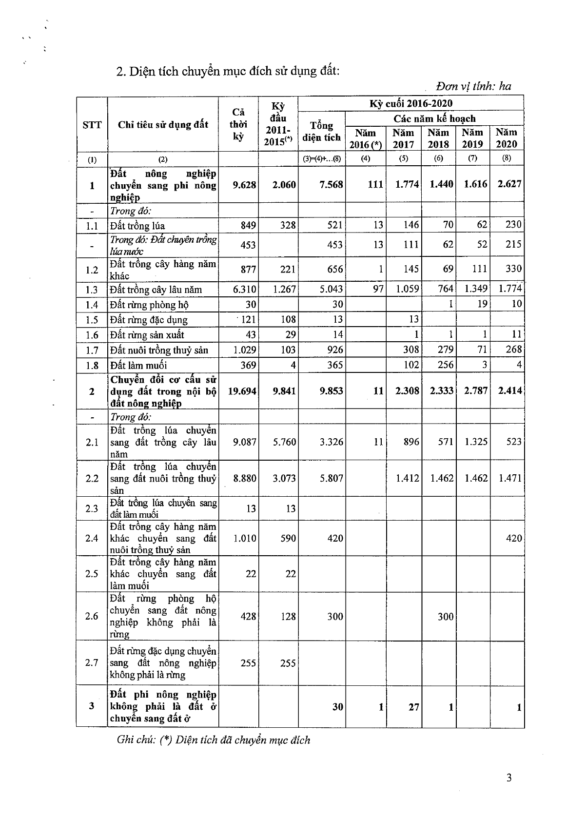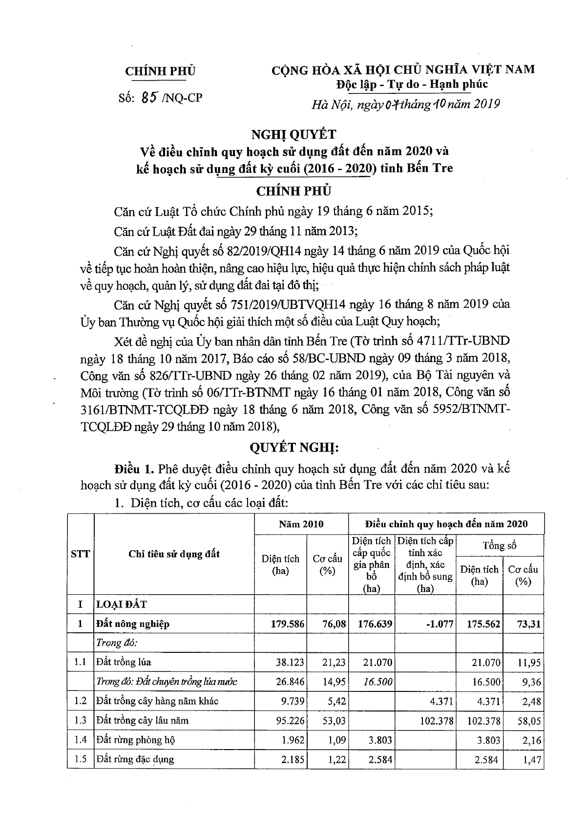 Nghị quyết 85/NQ-CP của Chính phủ về việc điều chỉnh quy hoạch sử dụng đất đến năm 2020 và kế hoạch sử dụng đất kỳ cuối (2016-2020) tỉnh Bến Tre.