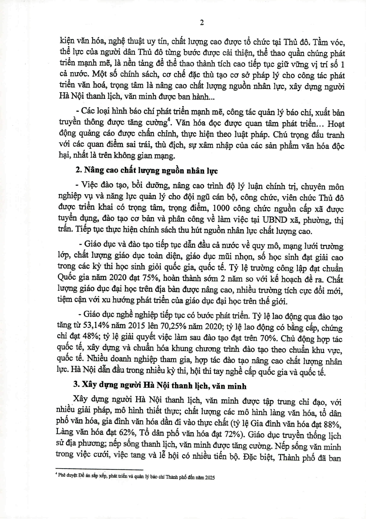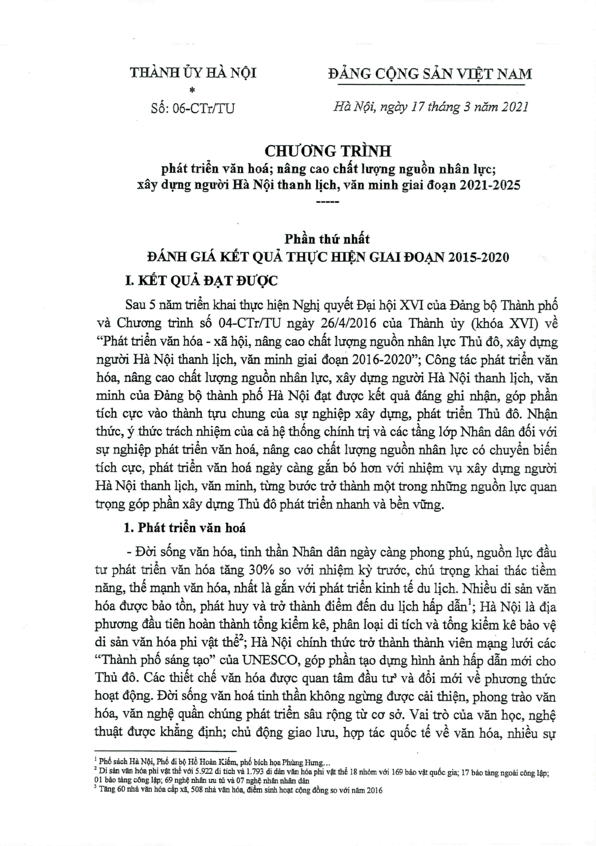 Ngày 17/3/2021, Thành uỷ Hà Nội đã ban hành Chương trình số 06-CTr/TU về “Phát triển văn hóa, nâng cao chất lượng nguồn nhân lực, xây dựng người Hà Nội thanh lịch văn minh giai đoạn 2021-2025”.