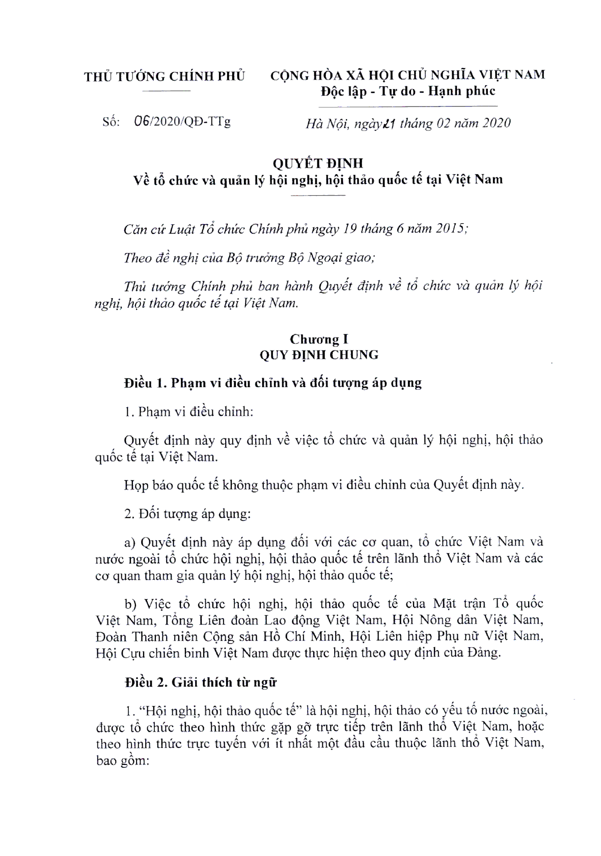 Quyết định 06/2020/QĐ-TTg của Thủ tướng Chính phủ về việc tổ chức và quản lý hội nghị, hội thảo quốc tế tại Việt Nam.