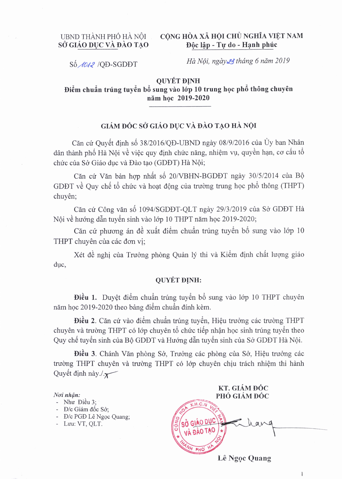 Giám đốc Sở Giáo dục và Đào tạo Thành phố Hà Nội đã ban hành Quyết định 1012/QĐ-SGDĐT về điểm chuẩn trúng tuyển bổ sung vào lớp 10 trung học phổ thông chuyên năm học 2019-2020 ngày 23/6/2019.