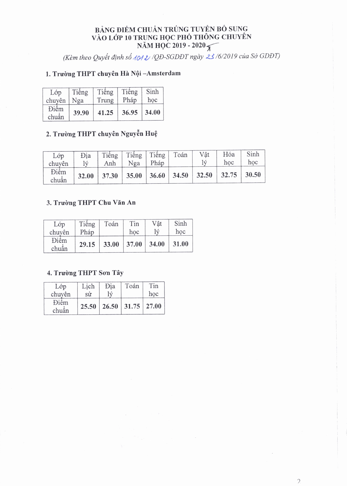 Cũng trong Quyết định này, Sở Giáo dục và Đào tạo Thành phố Hà Nội công bố điểm chuẩn trúng tuyển bổ sung vào trường THPT Chu Văn An và trường THPT Sơn Tây. Trong đó, điểm trúng tuyển trường THPT Chu Văn An cụ thể như sau: Lớp chuyên môn tiếng Pháp là 29.15 điểm, lớp chuyên môn Toán là 33.00 điểm, lớp chuyên môn Tin học là 37.00 điểm, lớp chuyên môn Vật lý là 34.00 điểm và lớp chuyên môn Sinh học là 31 điểm.