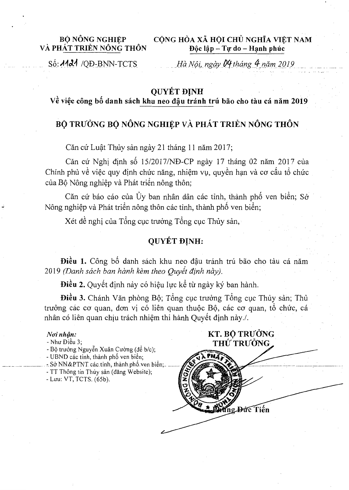 Quyết định 1121/QĐ-BNN-TCTS của Bộ Nông nghiệp và Phát triển nông thôn về việc công bố danh sách khu neo đậu tránh trú bão cho tàu cá năm 2019.