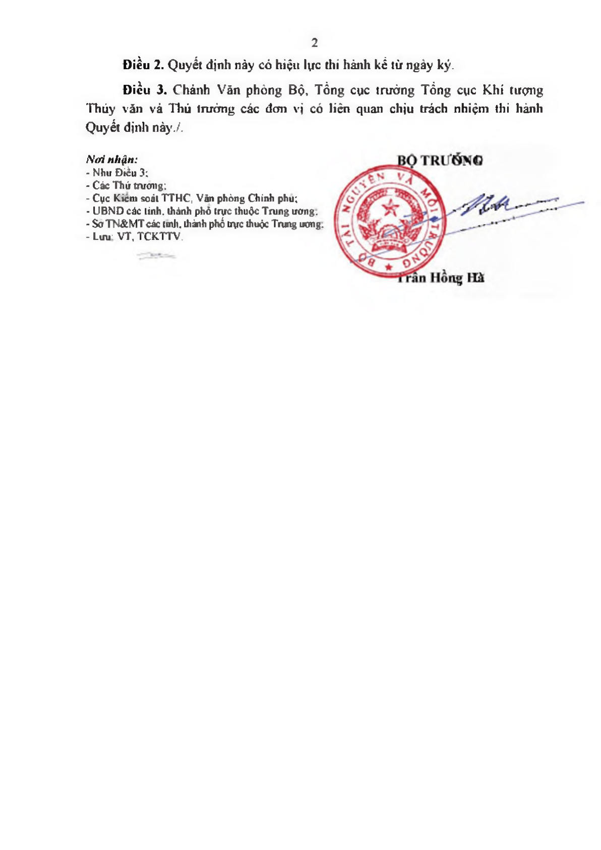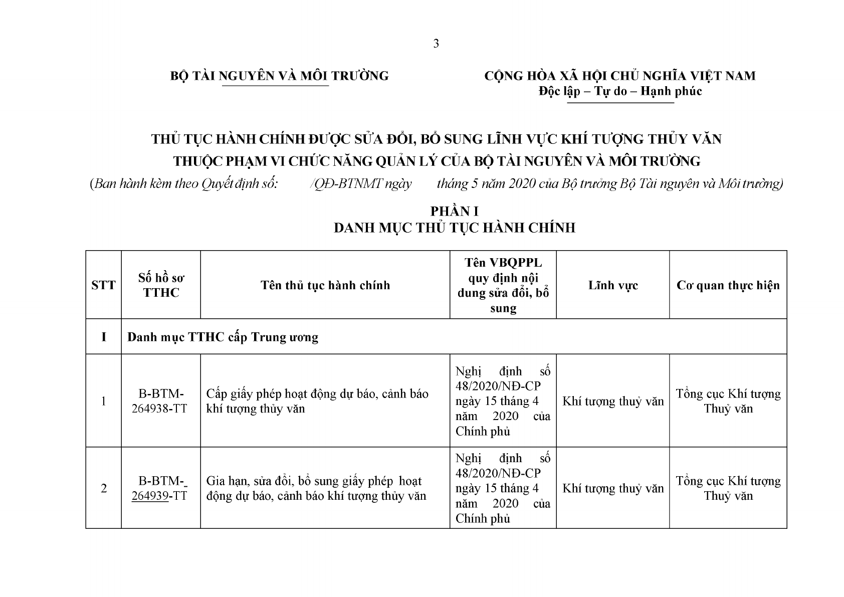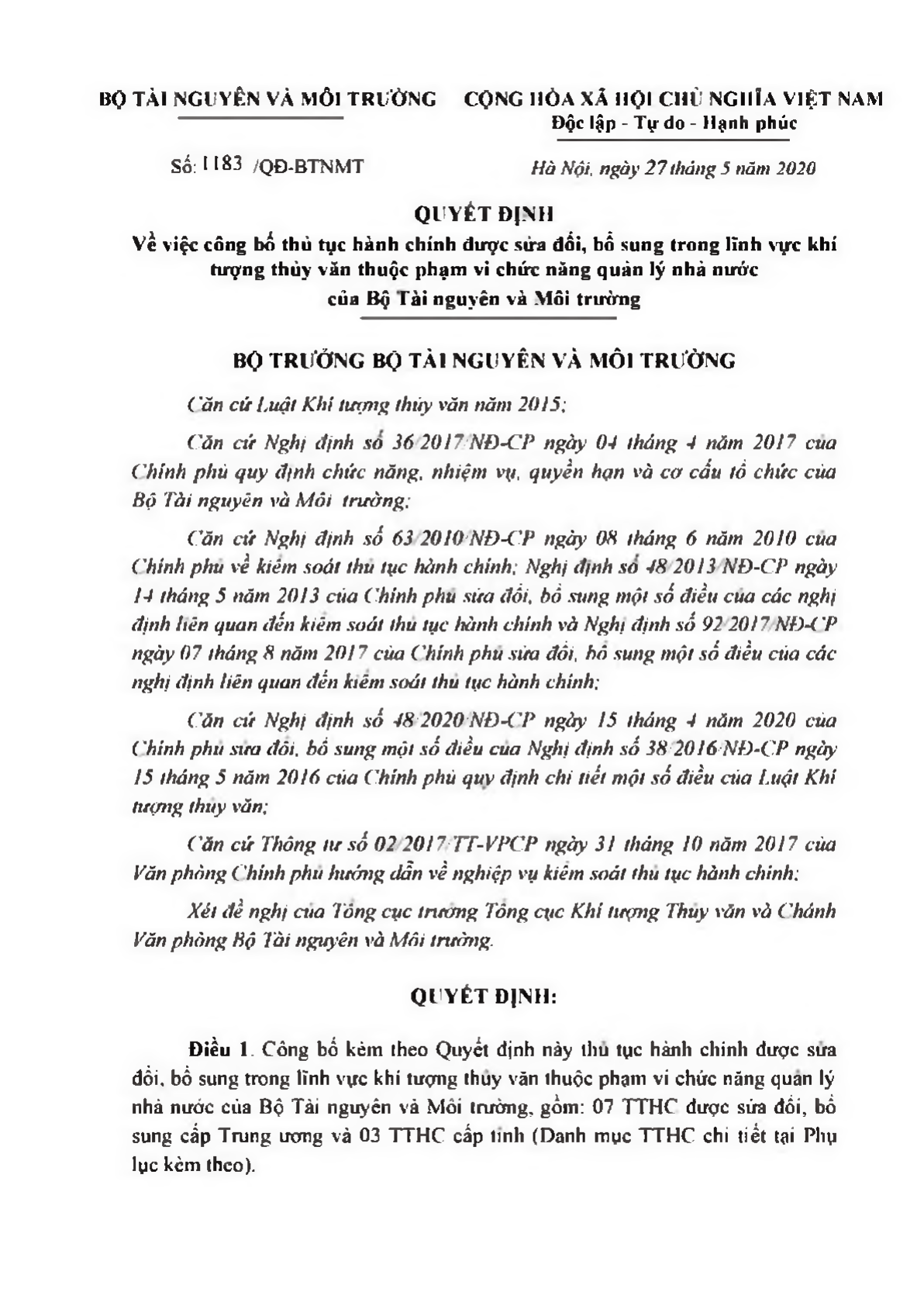 Ngày 27/5/2020, Bộ Tài nguyên và Môi trường ban hành Quyết định 1183/QĐ-BTNMT về việc công bố thủ tục hành chính được sửa đổi, bổ sung trong lĩnh vực khí tượng thủy văn thuộc phạm vi chức năng quản lý nhà nước của Bộ Tài nguyên và Môi trường.