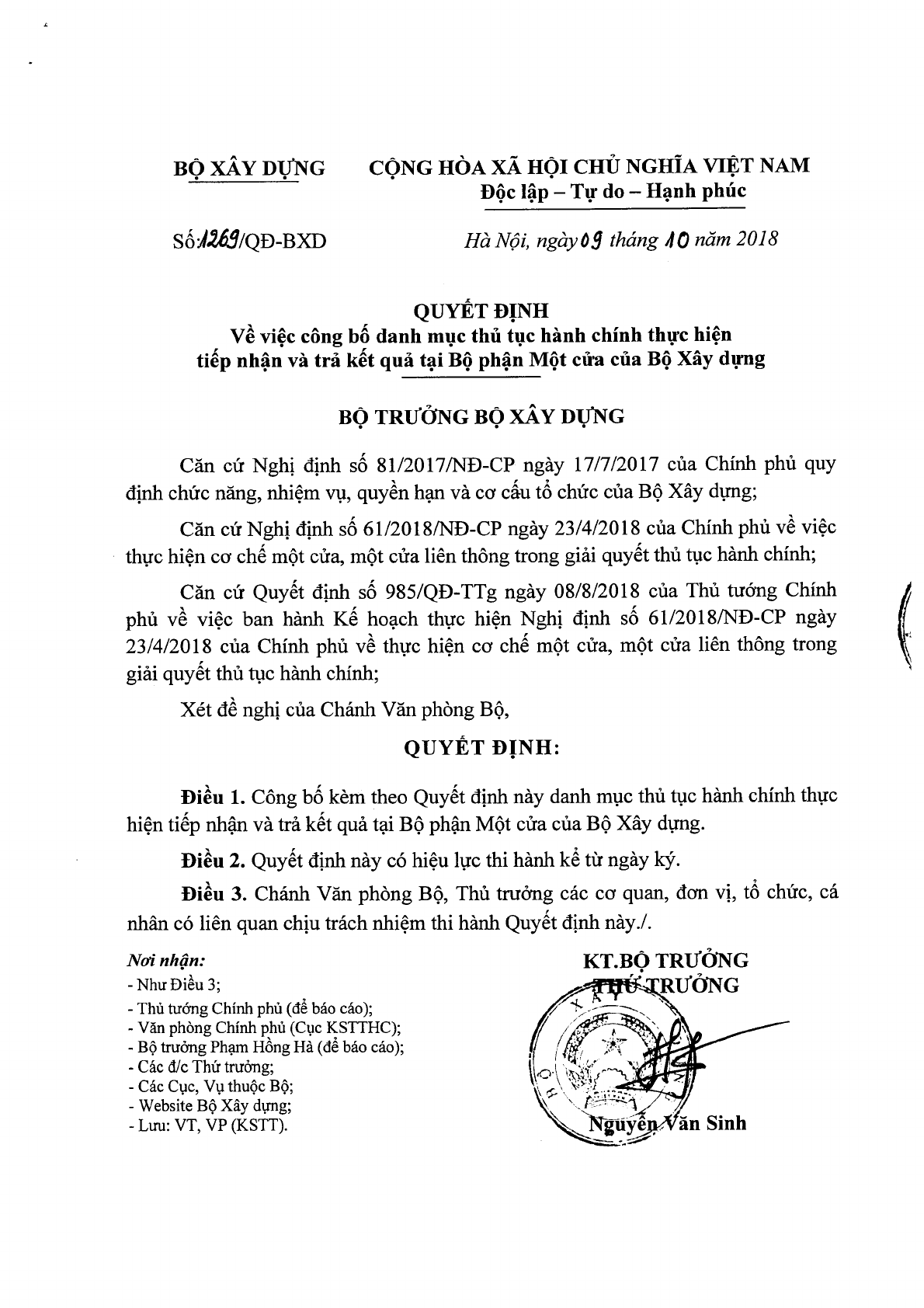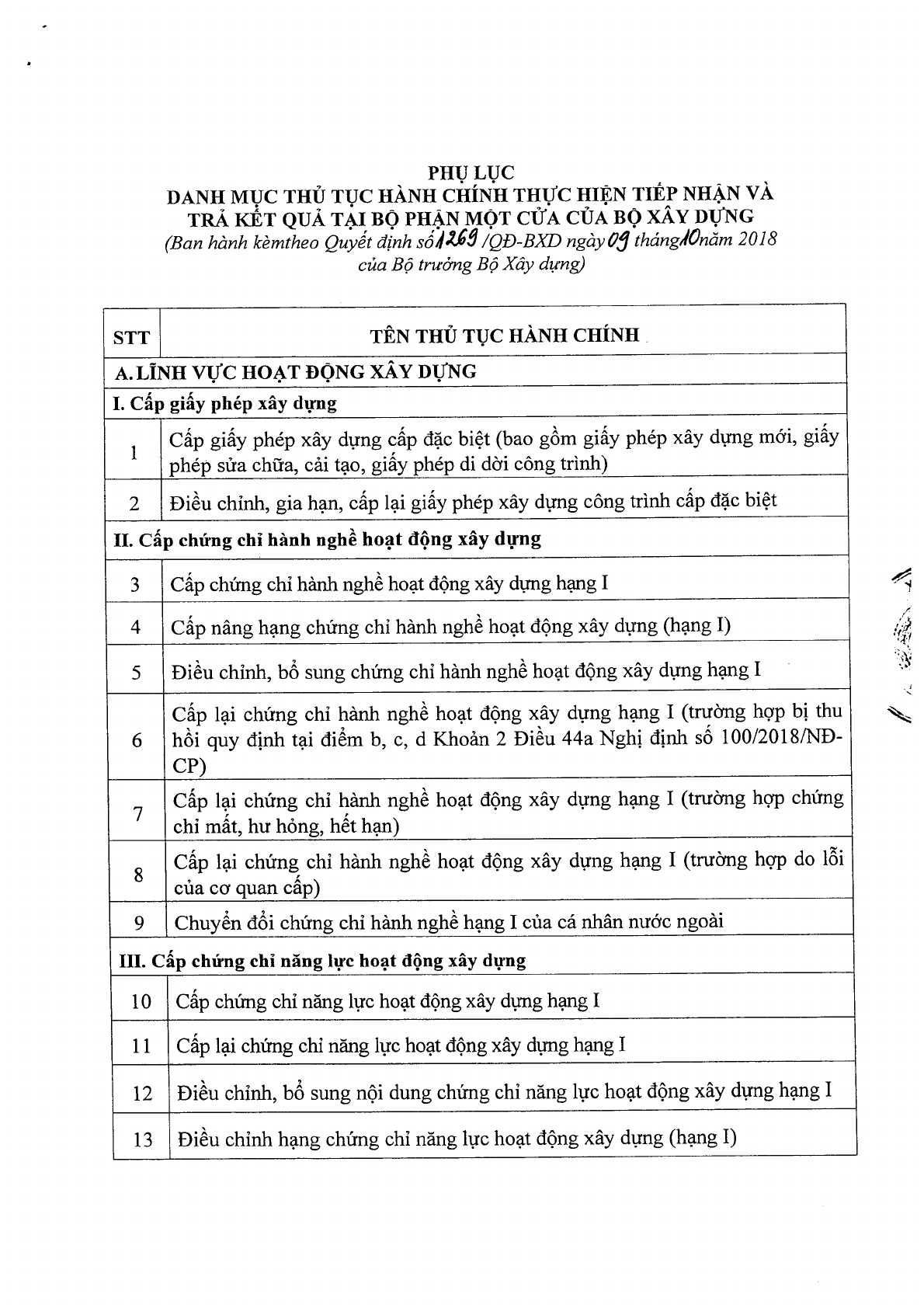 Ngày 09/10/2018, Bộ Xây dựng ban hành Quyết định số 1269/QĐ-BXD công bố Danh mục thủ tục hành chính thực hiện tiếp nhận và trả kết quả tại Bộ phận Một cửa của Bộ Xây dựng.