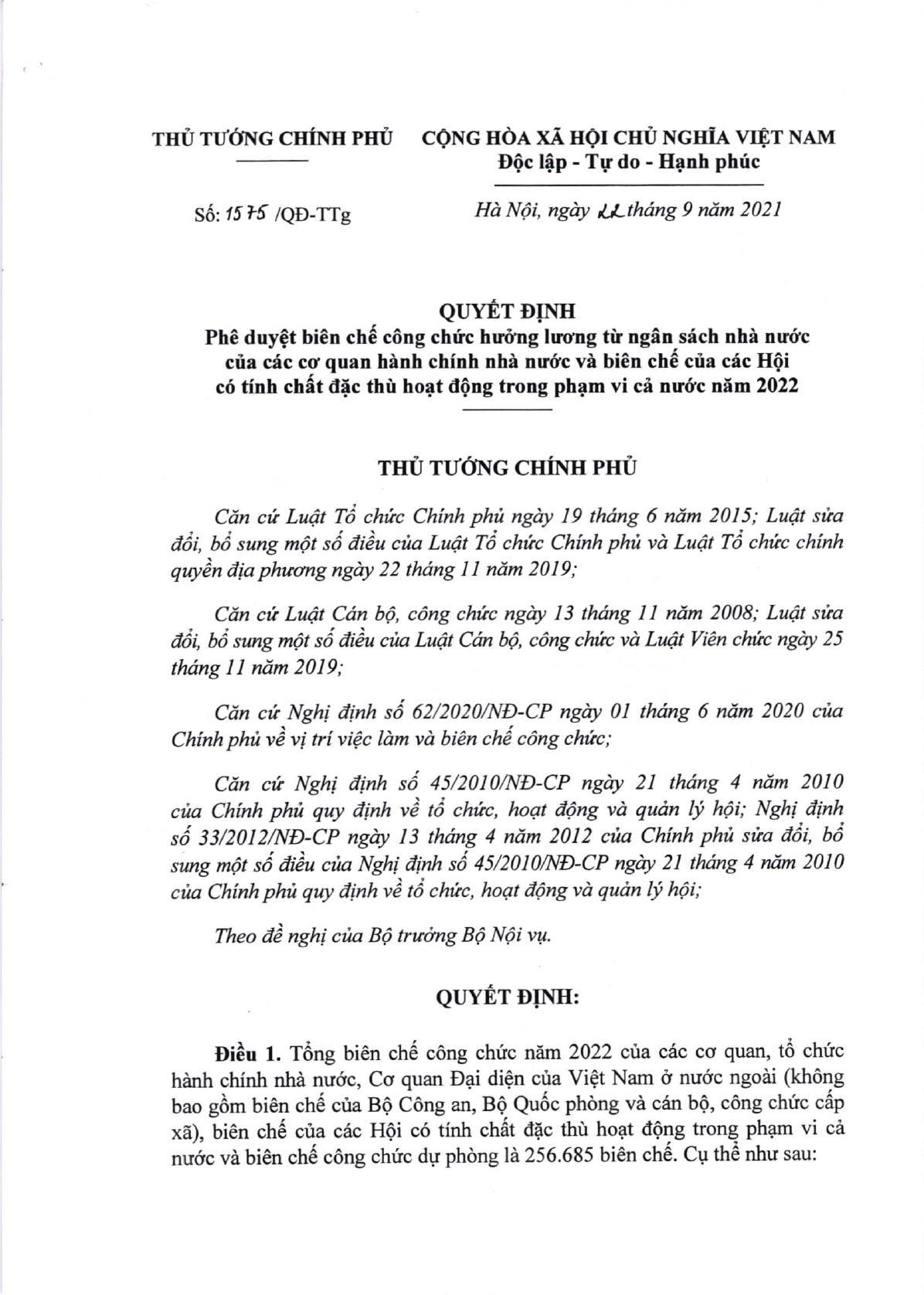 Ngày 22/9 năm 2021 Thủ tướng Chính phủ Phạm Minh Chính đã ký Quyết định 1575 QĐ-TTg phê duyệt biên chế công chức hưởng lương từ ngân sách nhà nước của các cơ quan hành chính nhà nước và biên chế của các Hội có tính chất đặc thù hoạt động trong phạm vi cả nước năm 2022.