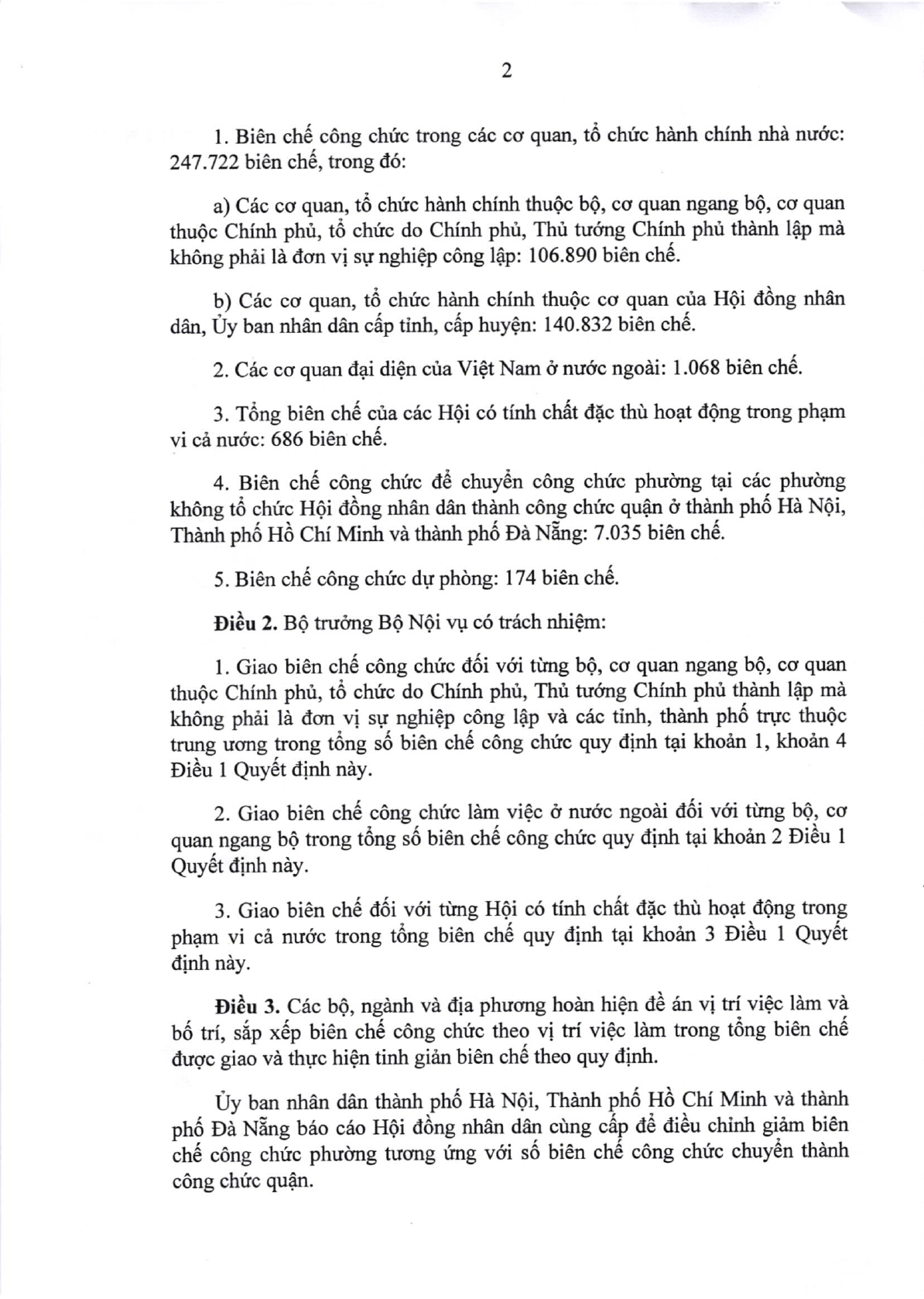 Biên chế công chức trong các cơ quan, tổ chức hành chính nhà nước là 247.722 biên chế, trong đó: