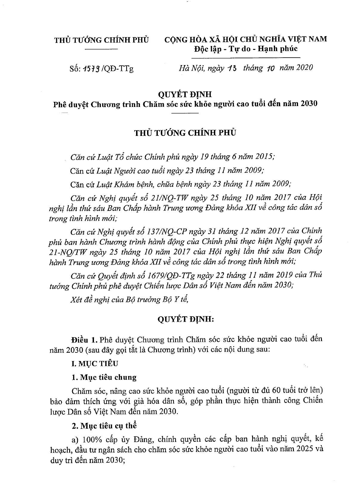 Ngày 13/10/2020, Thủ tướng Chính phủ ban hành Quyết định 1579/QĐ-TTg về việc phê duyệt Chương trình Chăm sóc sức khỏe người cao tuổi đến năm 2030.