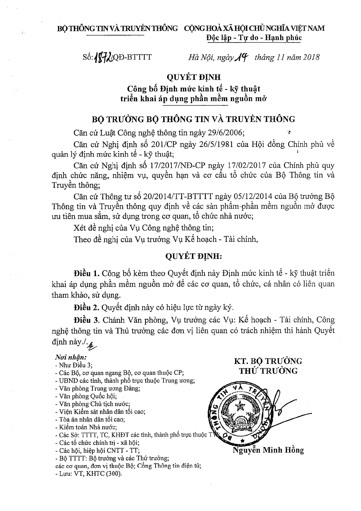 Quyết định 1872/QĐ-BTTTT năm 2018 công bố định mức kinh tế - kỹ thuật triển khai áp dụng phần mềm nguồn mở do Bộ trưởng Bộ thông tin và truyền thông ban hành.