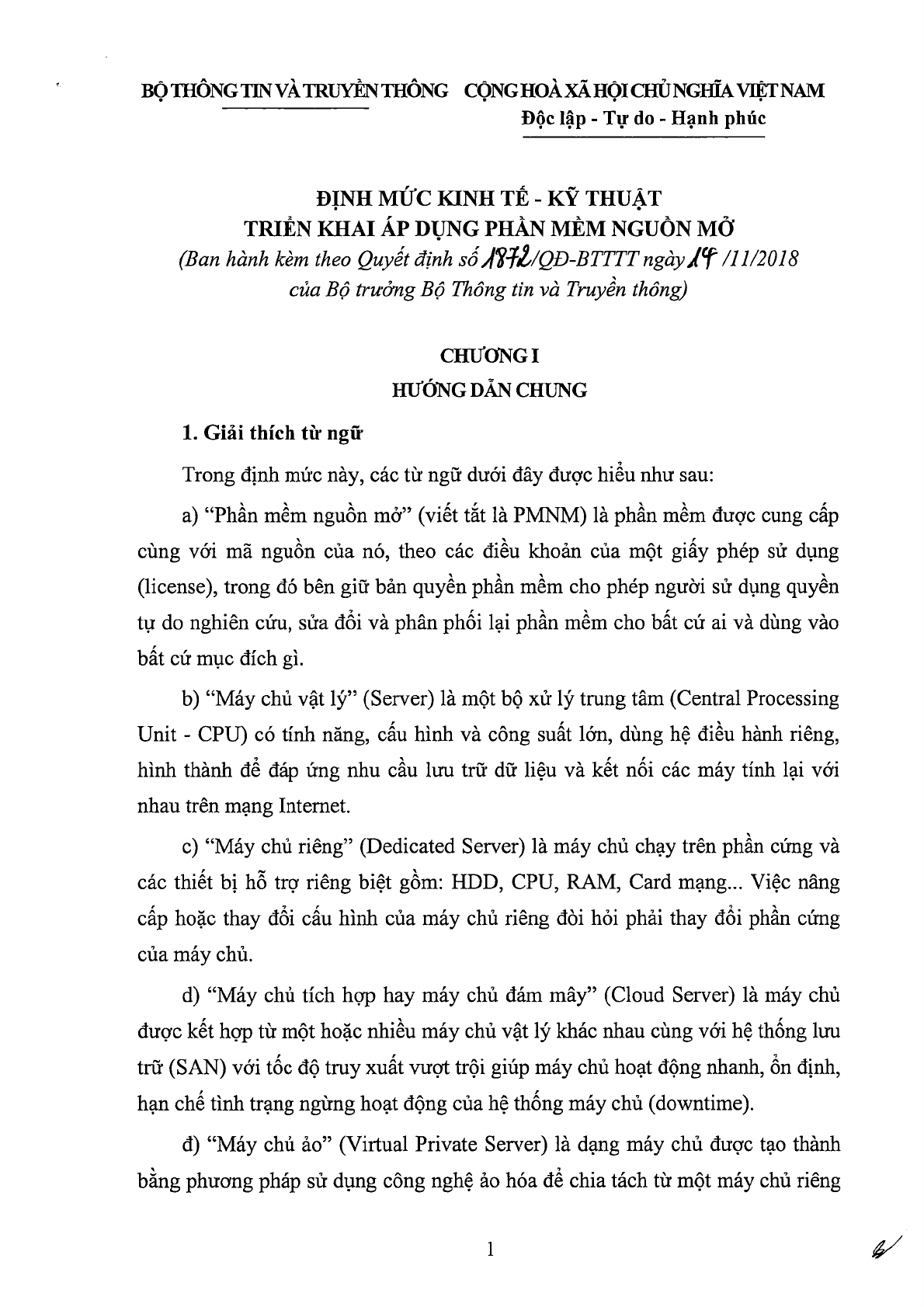 Quyết định 1872/QĐ-BTTTT của Bộ Thông tin và Truyền thông về việc công bố Định mức kinh tế - kỹ thuật triển khai áp dụng phần mềm nguồn mở được ban hành ngày 14/11/2018.