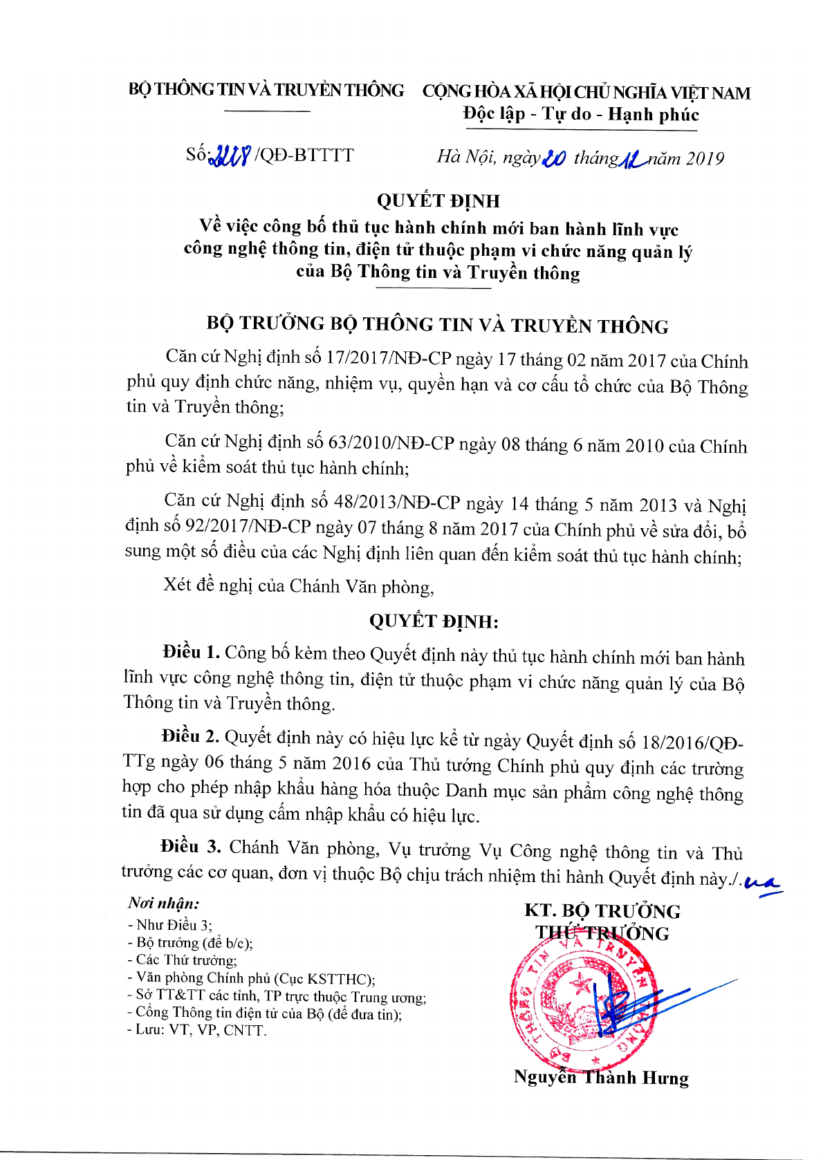 Quyết định 2228/QĐ-BTTTT 2019 thủ tục hành chính lĩnh vực công nghệ thông tin