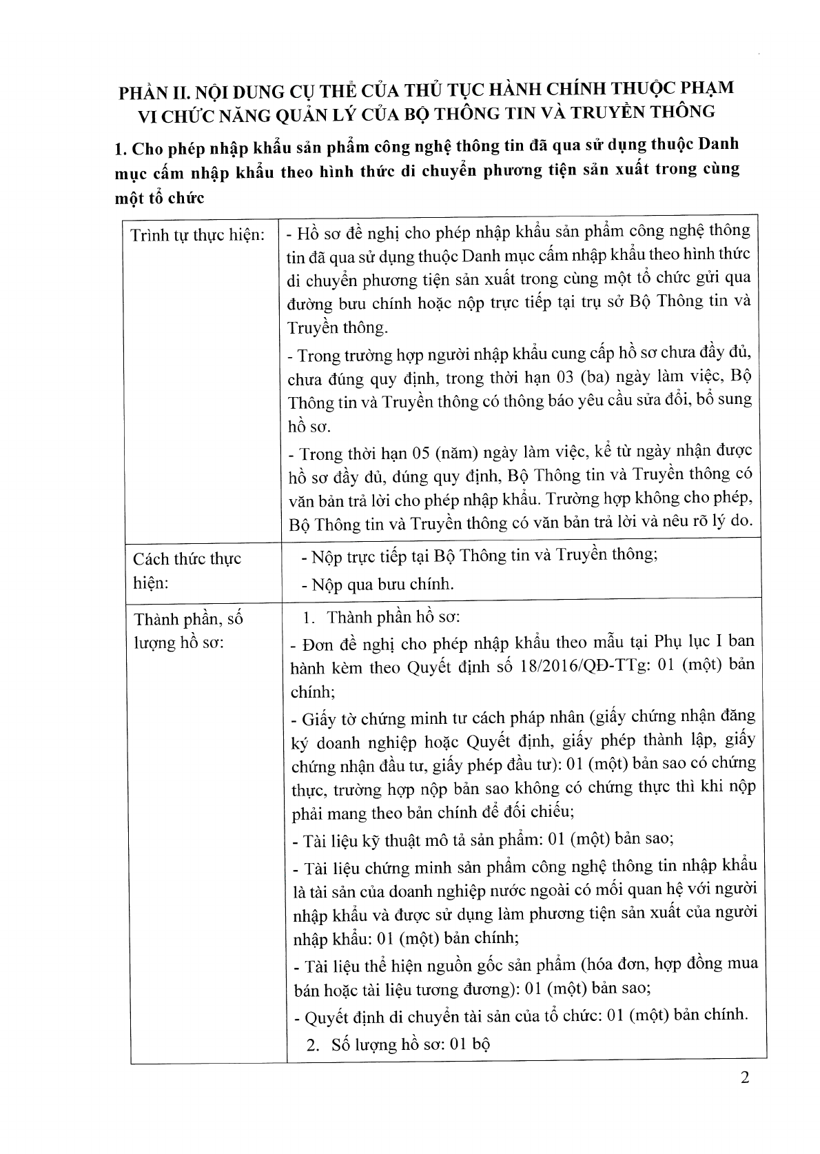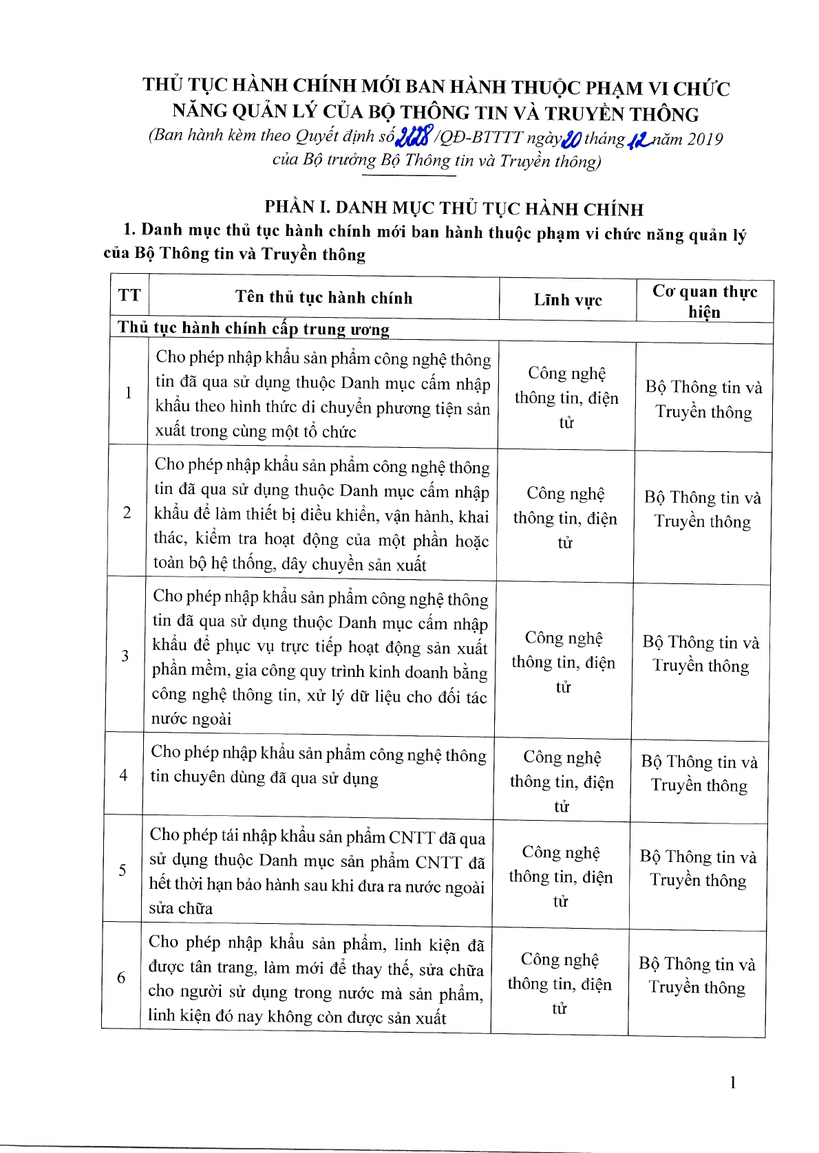 Trong đó, Bộ trưởng ban hành mới 06 thủ tục hành chính cấp trung ương: Cho phép nhập khẩu sản phẩm công nghệ thông tin đã qua sử dụng thuộc Danh mục cấm nhập khẩu theo hình thức di chuyển phương tiện sản xuất trong cùng một tổ chức; Cho phép nhập khẩu sản phẩm công nghệ thông tin chuyên dùng đã qua sử dụng; Cho phép tái nhập khẩu sản phẩm công nghệ thông tin đã qua sử dụng thuộc Danh mục sản phẩm công nghệ thông tin đã hết thời hạn bảo hành sau khi đưa ra nước ngoài sửa chữa;…