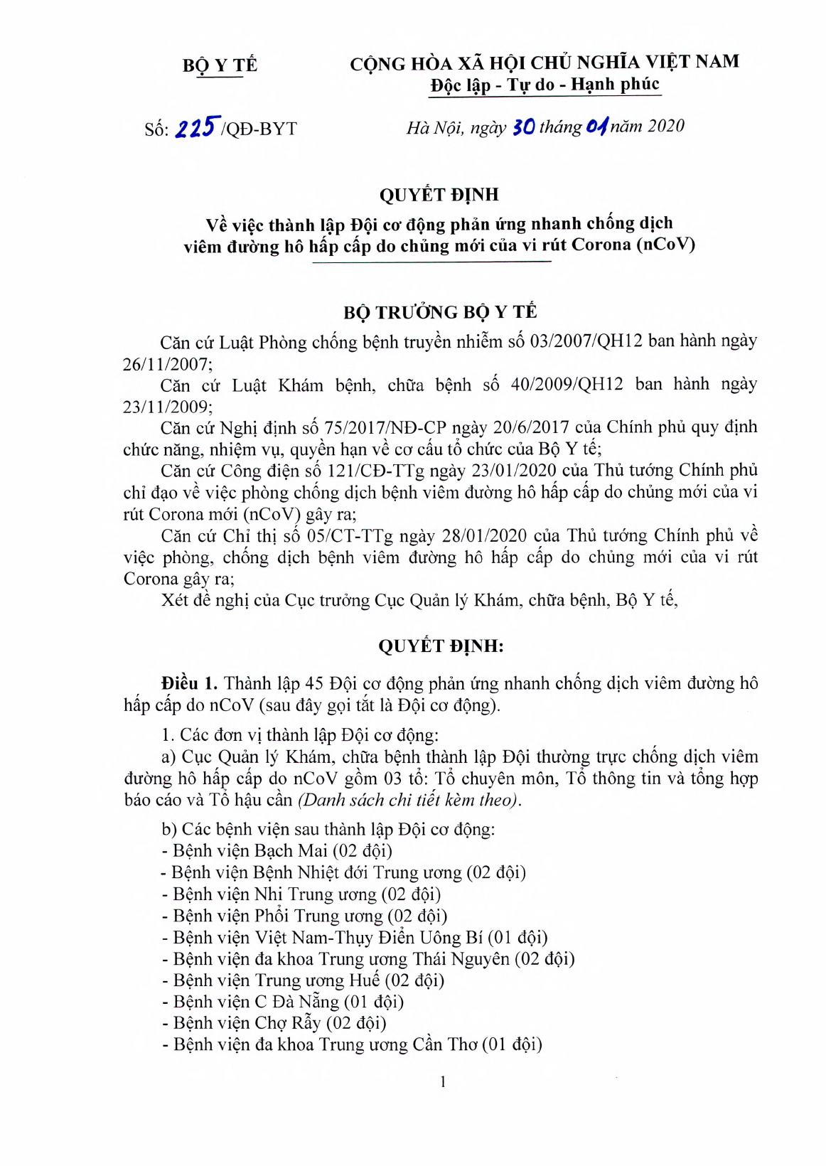 Ngày 30/01/2020, Bộ trưởng Bộ Y tế đã ban hành Quyết định 225/QĐ-BYT về việc thành lập Đội cơ động phản ứng nhanh chống dịch viêm đường hô hấp cấo do chủng mới của vi rút Corona (nCoV).