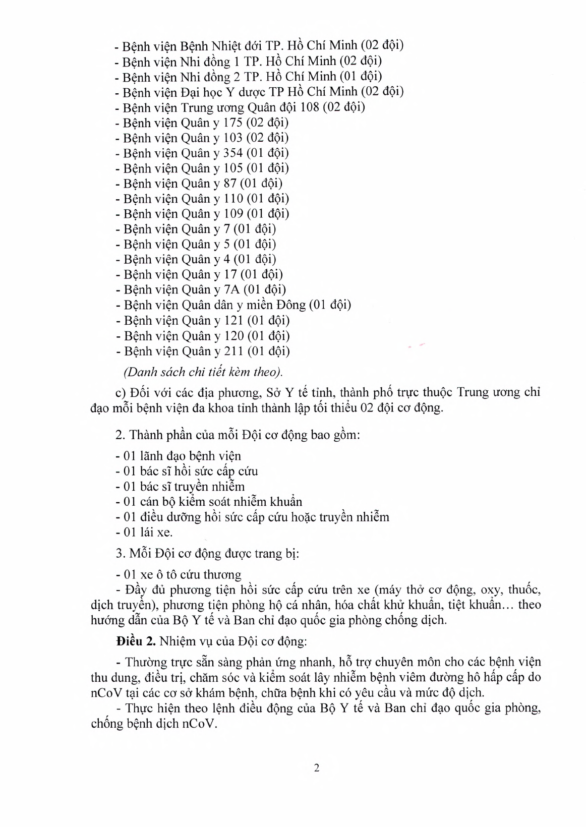 Thứ hai, các bệnh viện sau thành lập Đội cơ động: Bệnh viện Bạch Mai (02 đội), Bệnh viện Nhiệt đới Trung ương (02 đội), Bệnh viện Nhi Trung ương (02 đội), Bệnh viện Phổi Trung ương (02 đội), Bệnh viện đa khoa Trung ương Thái Nguyên (02 đội), Bệnh viện Chợ Rẫy (02 đội), Bệnh viện Bệnh Nhiệt đới TP. Hồ Chí Minh (02 đội), Bệnh viện Trung ương Quân đội 108 (02 đội),…