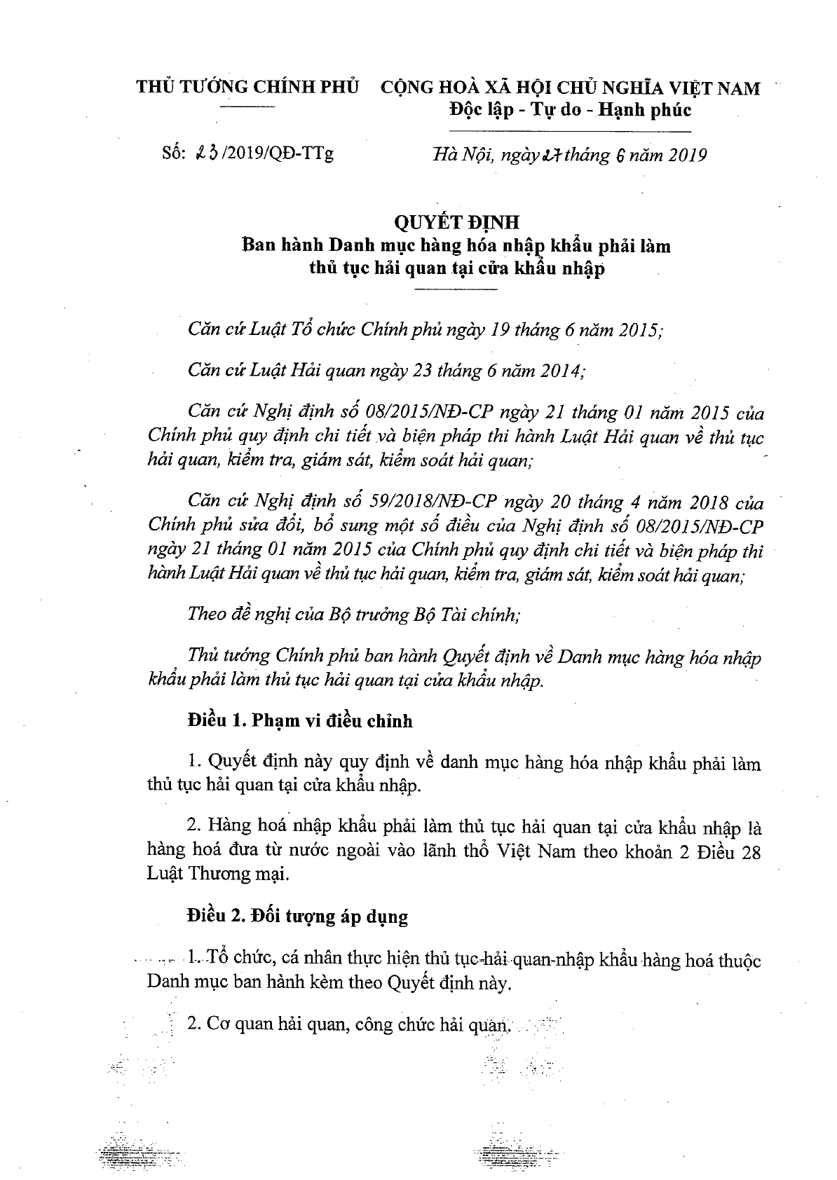 Quyết định 23/2019/QĐ-TTg của Thủ tướng Chính phủ về việc ban hành Danh mục hàng hóa nhập khẩu phải làm thủ tục hải quan tại cửa khẩu nhập.