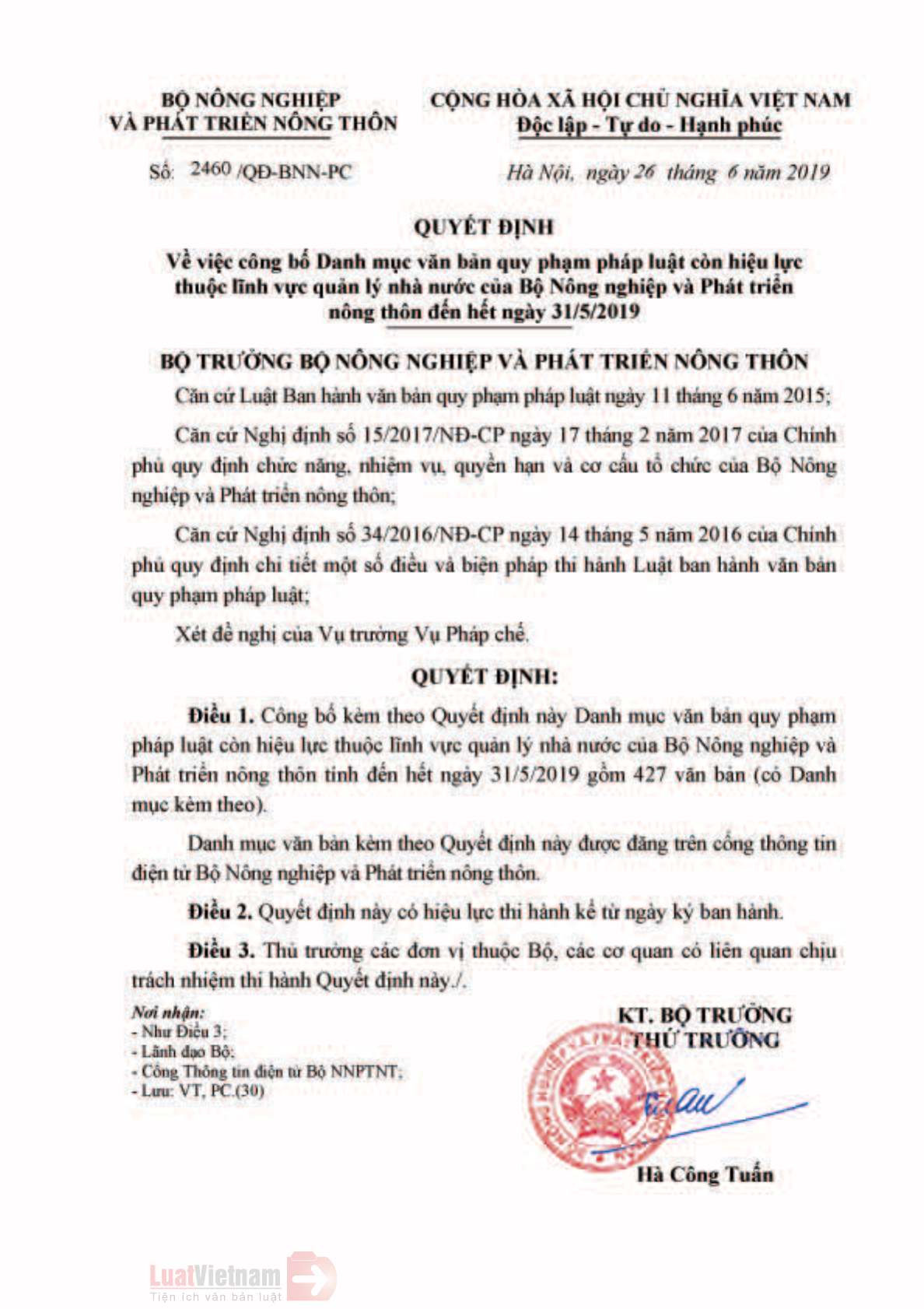 Ngày 26/6/2019, Bộ Nông nghiệp và Phát triển nông thôn ban hành Quyết định 2460/QĐ-BNN-PC về việc công bố Danh mục văn bản quy phạm pháp luật còn hiệu lực thuộc lĩnh vực quản lý Nhà nước của Bộ Nông nghiệp và Phát triển nông thôn đến hết ngày 31/05/2019.