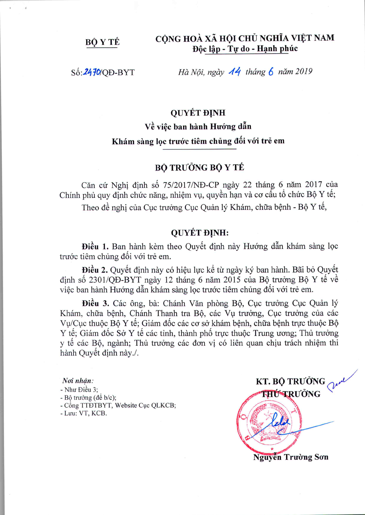 Quyết định 2470/QĐ-BYT năm 2019 về hướng dẫn khám sàng lọc trước tiêm chủng đối với trẻ em do Bộ trưởng Bộ y tế ban hành.