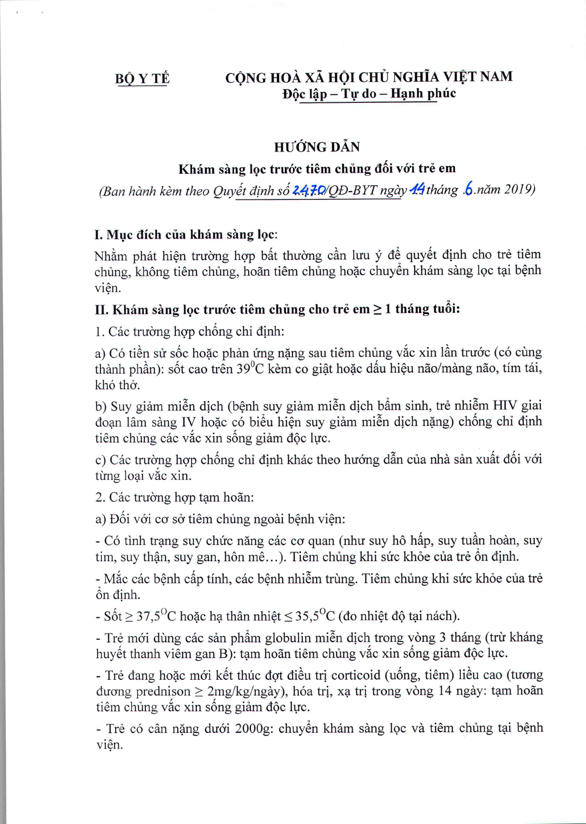 Ngày 14/6/2019, Bộ Y tế ban hành Quyết định 2470/QĐ-BYT hướng dẫn khám sàng lọc trước tiêm chủng đối với trẻ em nhằm phát hiện trường hợp bất thường cần lưu ý để giải quyết cho trẻ tiêm chủng, không tiêm chủng, hoãn tiêm chủng hoặc chuyển khám sàng lọc tại bệnh viện.