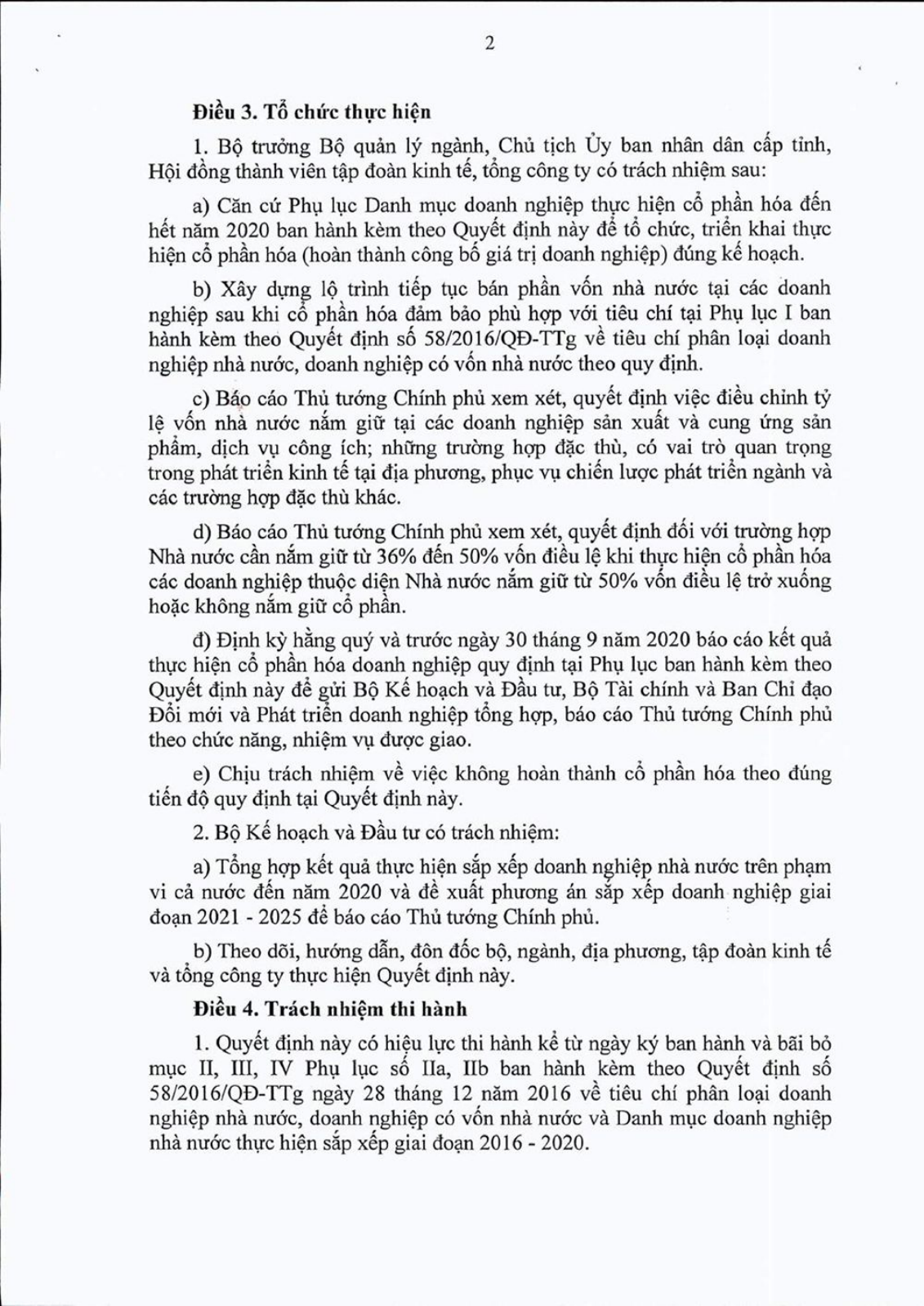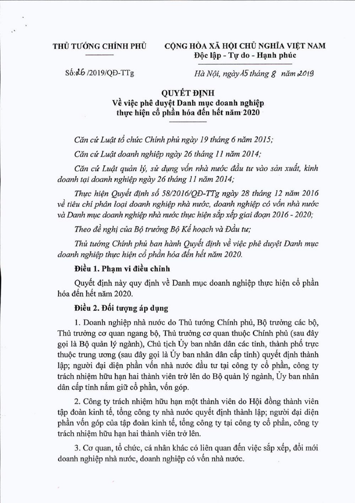 Ngày 15/8/2019, Thủ tướng Chính phủ ban hành Quyết định 26/2019/QĐ-TTg về việc phê duyệt Danh mục doanh nghiệp thực hiện cổ phần hóa đến hết năm 2020.