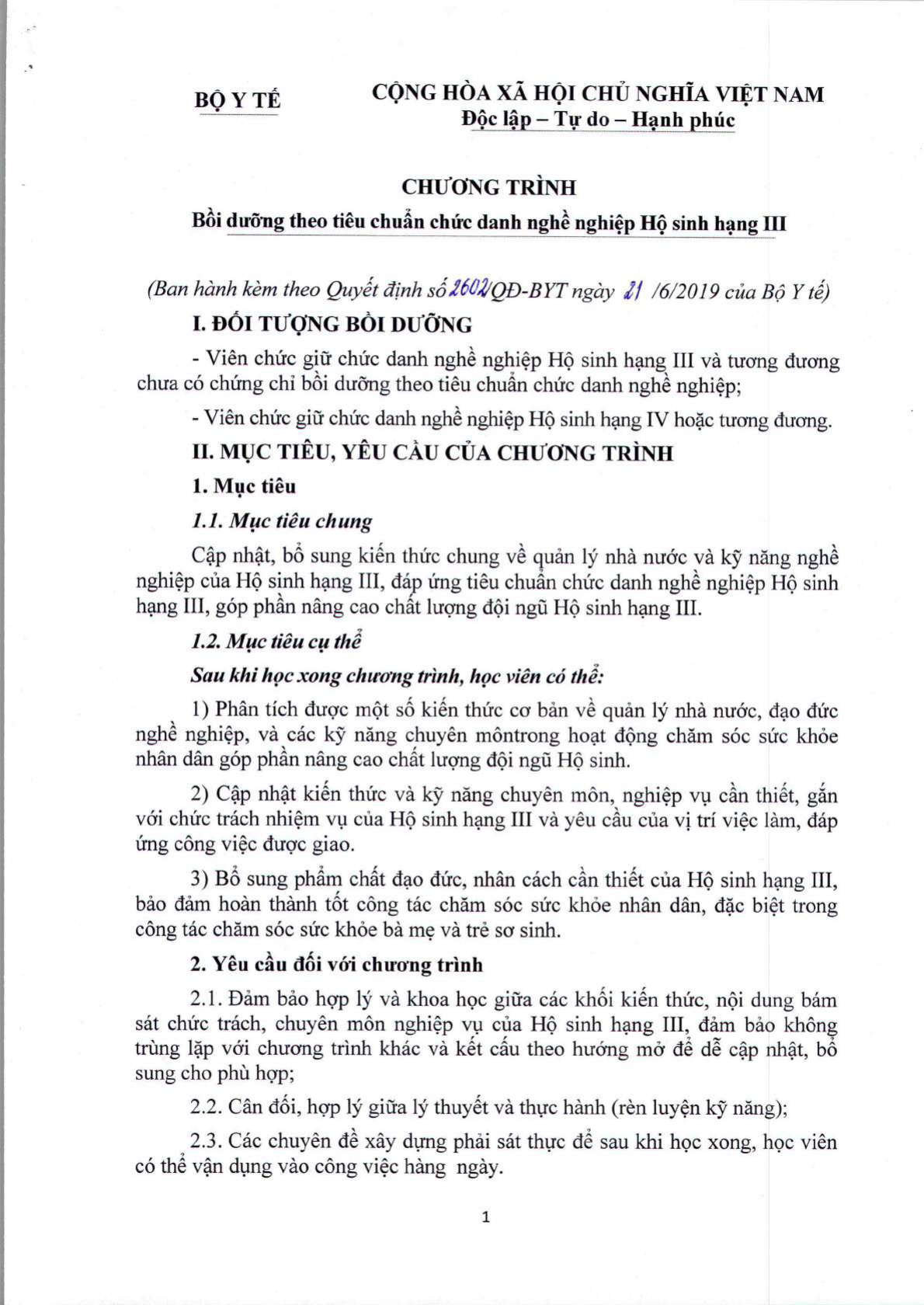 Ngày 21/06/2019, Bộ Y tế ra Quyết định 2602/QĐ-BYT về việc ban hành Chương trình bồi dưỡng theo tiêu chuẩn chức danh nghề nghiệp hộ sinh hạng III.