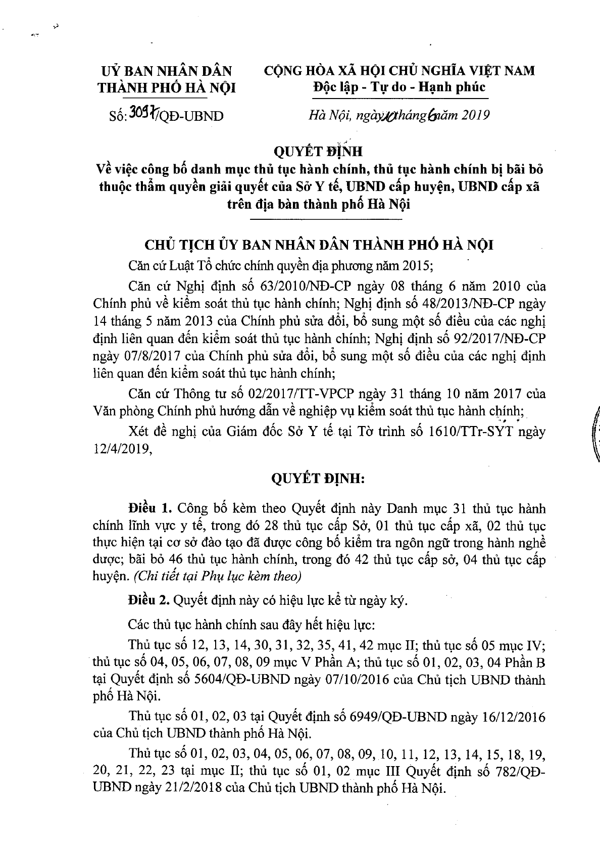 Quyết định 3097/QĐ-UBND của Ủy ban nhân dân Thành phố Hà Nội về việc công bố Danh mục thủ tục hành chính, thủ tục hành chính bị bãi bỏ thuộc thẩm quyền giải quyết của Sở Y tế, Ủy ban nhân dân cấp huyện, Ủy ban nhân dân cấp xã trên địa bàn Thành phố Hà Nội.