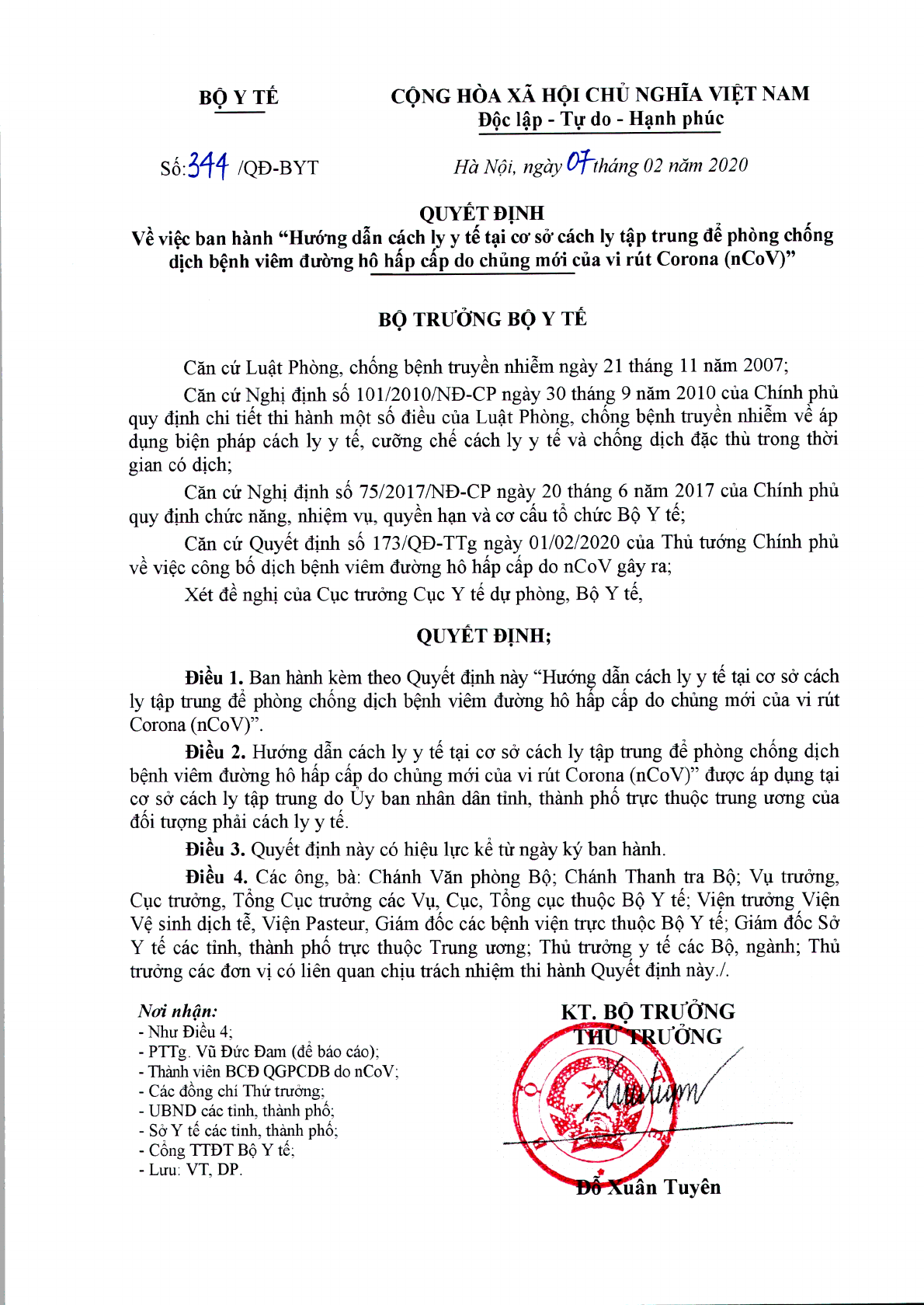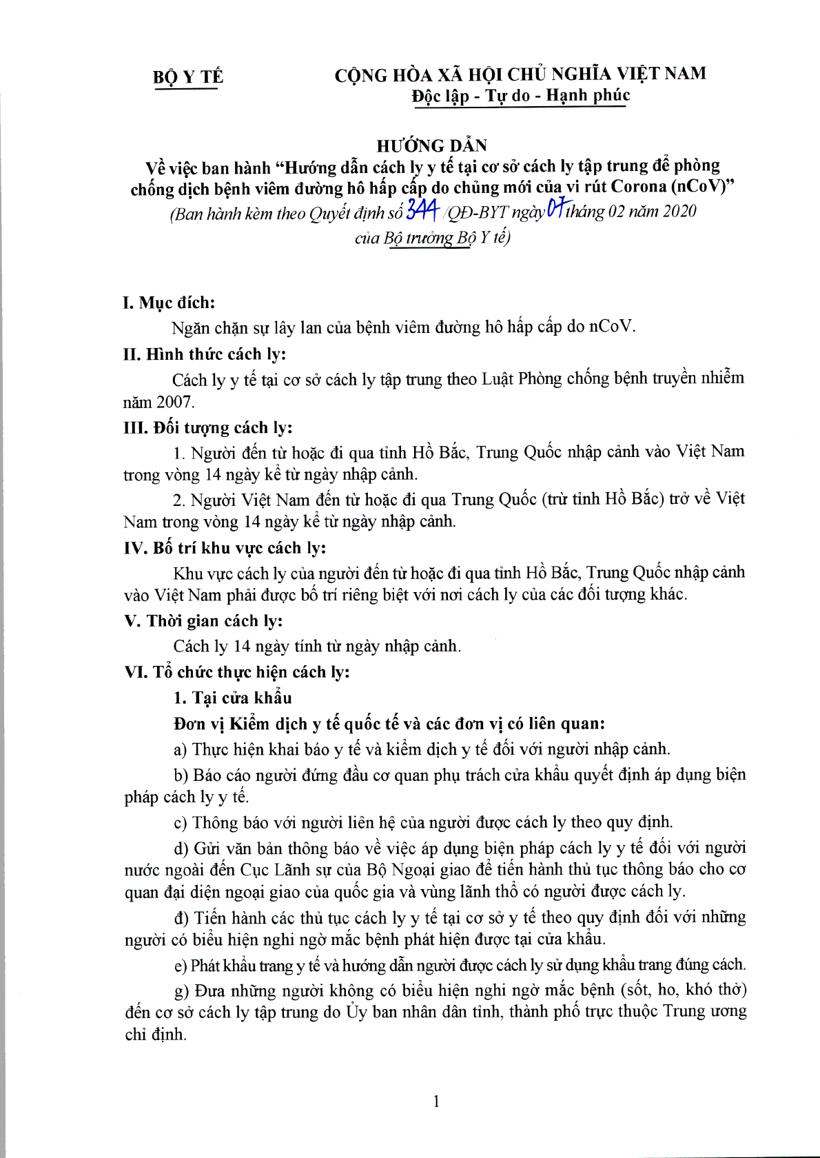 Ngày 07/02/2020, Bộ Y tế ra Quyết định 344/QĐ-BYT về việc ban hành "Hướng dẫn cách ly y tế tại cơ sở cách ly tập trung để phòng chống dịch bệnh viêm đường hô hấp cấp do chủng mới của vi rút Corona (nCoV)".
