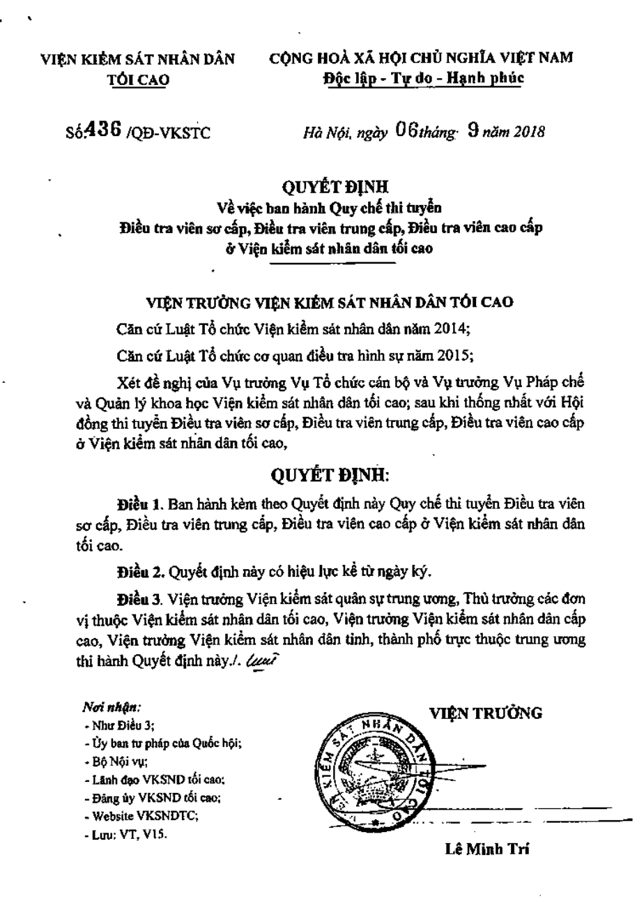 Quyết định 436/QĐ-VKSTC năm 2018 về quy chế thi tuyển điều tra viên sơ cấp, trung cấp, cao cấp ở viện kiểm sát nhân dân tối cao do Viện trưởng viện kiểm sát nhân dân tối cao ban hành.