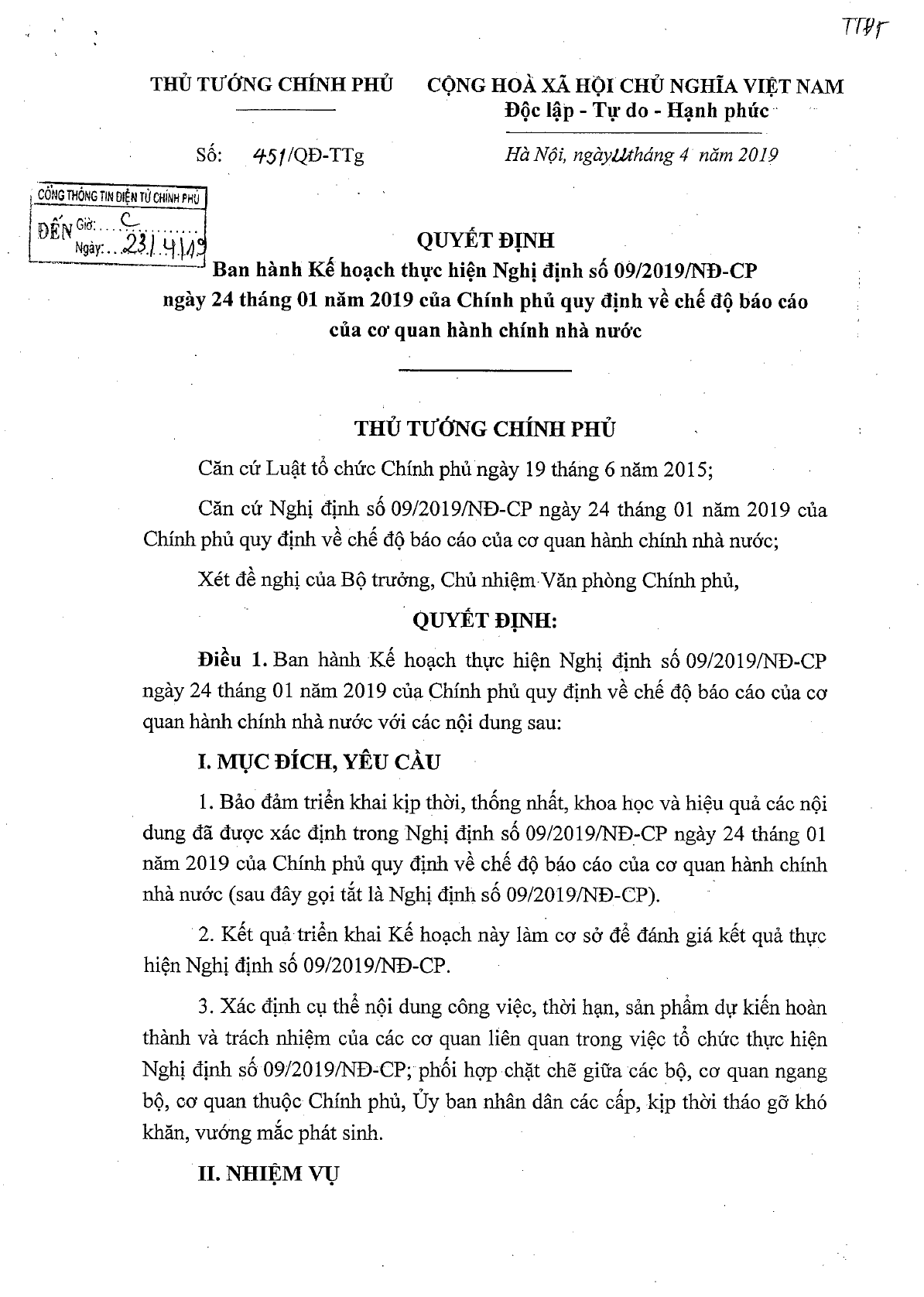 Ngày 22/04/2019, Thủ tướng Chính phủ ra Quyết định 451/QĐ-TTg ban hành Kế hoạch thực hiện Nghị định 09/2019/NĐ-CP quy định về chế độ báo cáo của cơ quan hành chính Nhà nước.