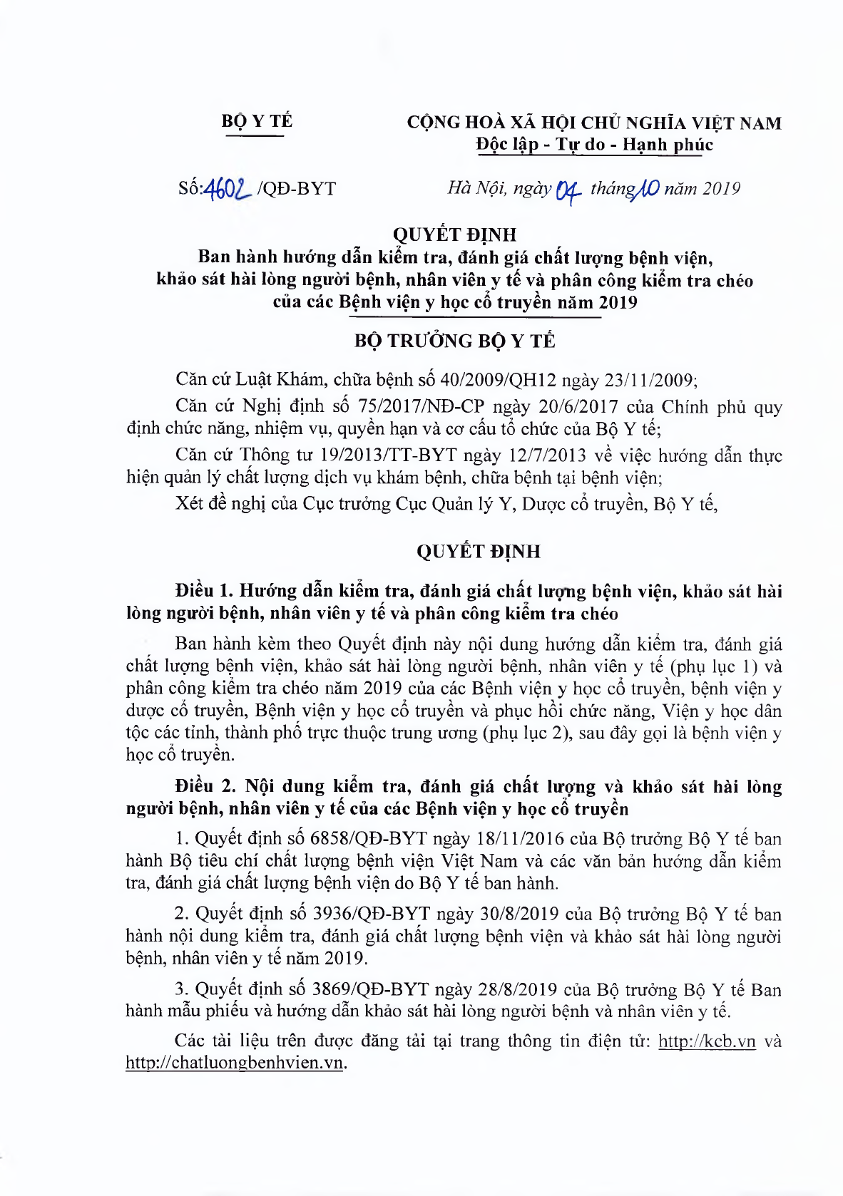 Quyết định 4602/QĐ-BYT về việc ban hành Hướng dẫn kiểm tra, đánh giá chất lượng bệnh viện, khảo sát hài lòng người bệnh, nhân viên y tế và phân công kiểm tra chéo của các Bệnh viện y học cổ truyền năm 2019 được Bộ trưởng Bộ Y tế thông qua ngày 04/10/2019.