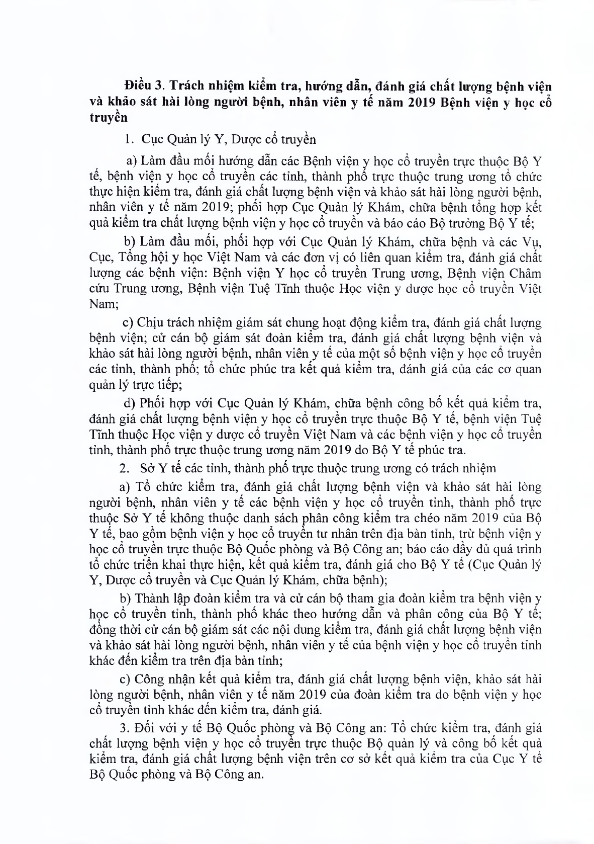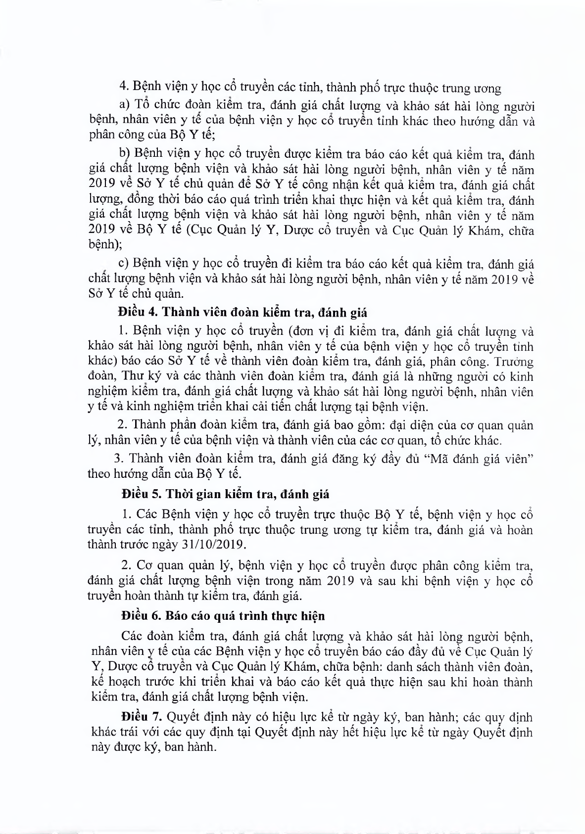 Ngày 4/10/2019 Bộ y tế ban hành quyết định 4602/QĐ-BYT. Theo đó, các Bệnh viện y học cổ truyền trực thuộc Bộ Y tế, bệnh viện y học cổ truyền tỉnh, thành phố trực thuộc trung ương tự kiểm tra, đánh giá và hoàn thành trước ngày 31/10/2019. Cụ thể, phân công Bệnh viện y học cổ truyền đi kiểm tra, đánh giá chất lượng bệnh viện khác như sau: Hải Phòng kiểm tra Hòa Bình; Kiên Giang kiểm tra Hà Đông; Lào Cai kiểm tra Thanh Hóa; Nghệ An kiểm tra Tây Ninh; Viện Y Dược học dân tộc TP.Hồ Chí Minh kiểm tra Sơn La;…