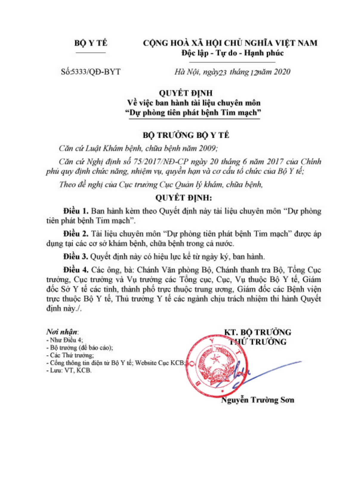 Quyết định 5333/QĐ-BYT của Bộ Y tế về việc ban hành tài liệu chuyên môn "Dự phòng tiên phát bệnh Tim mạch".