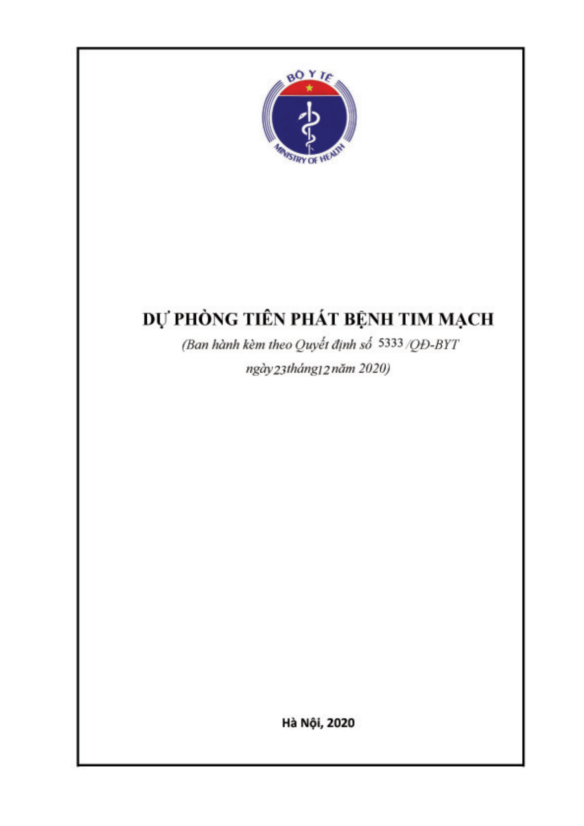 Ngày 23/12/2020, Bộ Y Tế ra Quyết định 5333/QĐ-BYT về việc ban hành tài liệu chuyên môn "Dự phòng tiên phát bệnh Tim mạch".