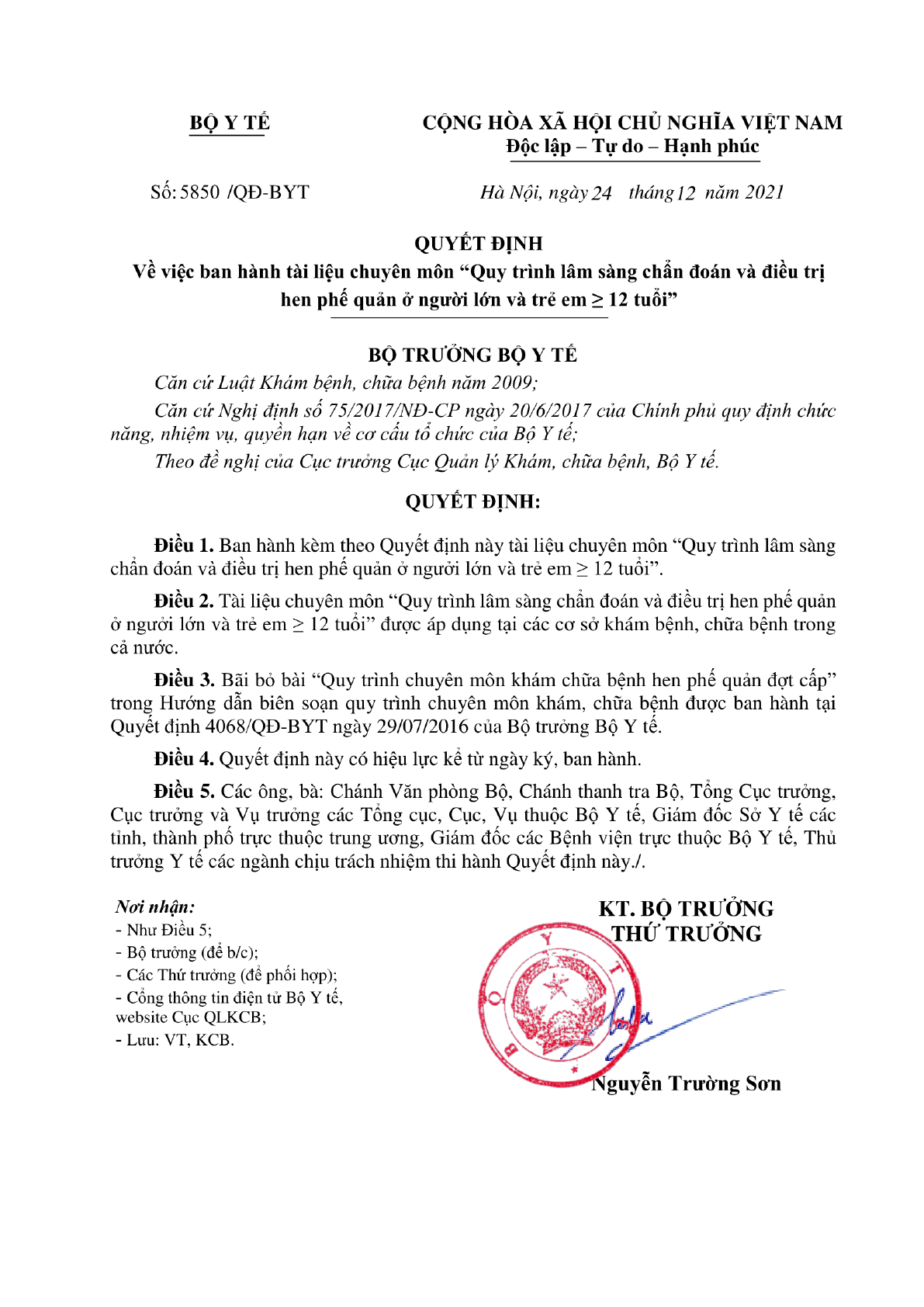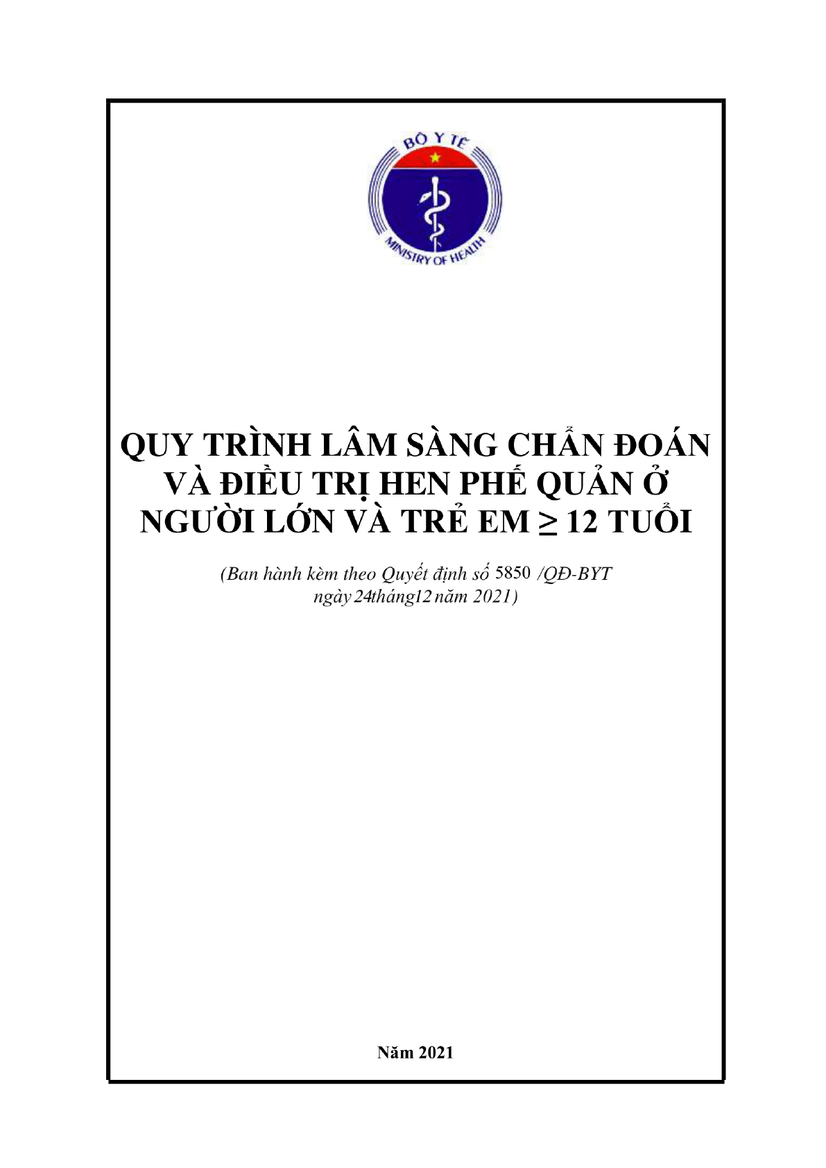 Quyết định 5850/QĐ-BYT 2021 Quy trình lâm sàng chẩn đoán và điều trị hen phế quản ở người lớn và trẻ em trên 12 tuổi