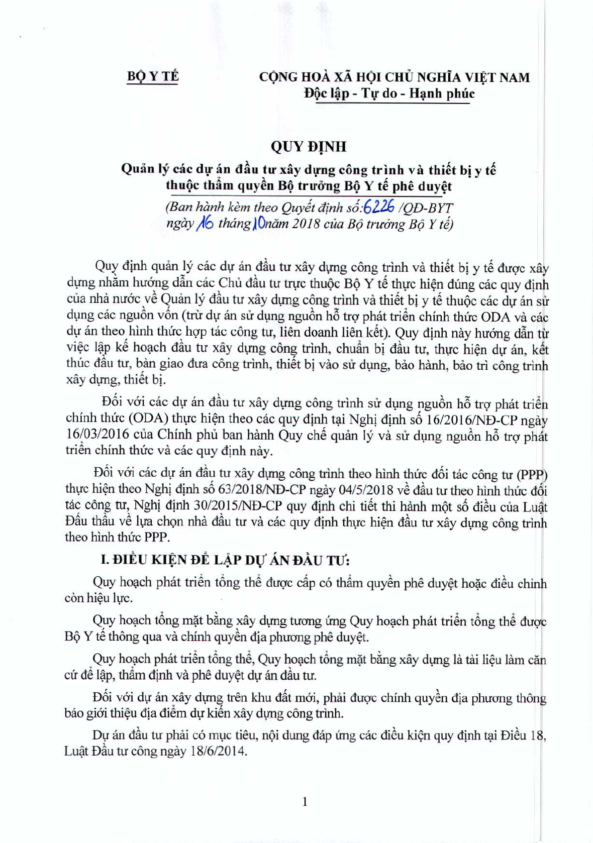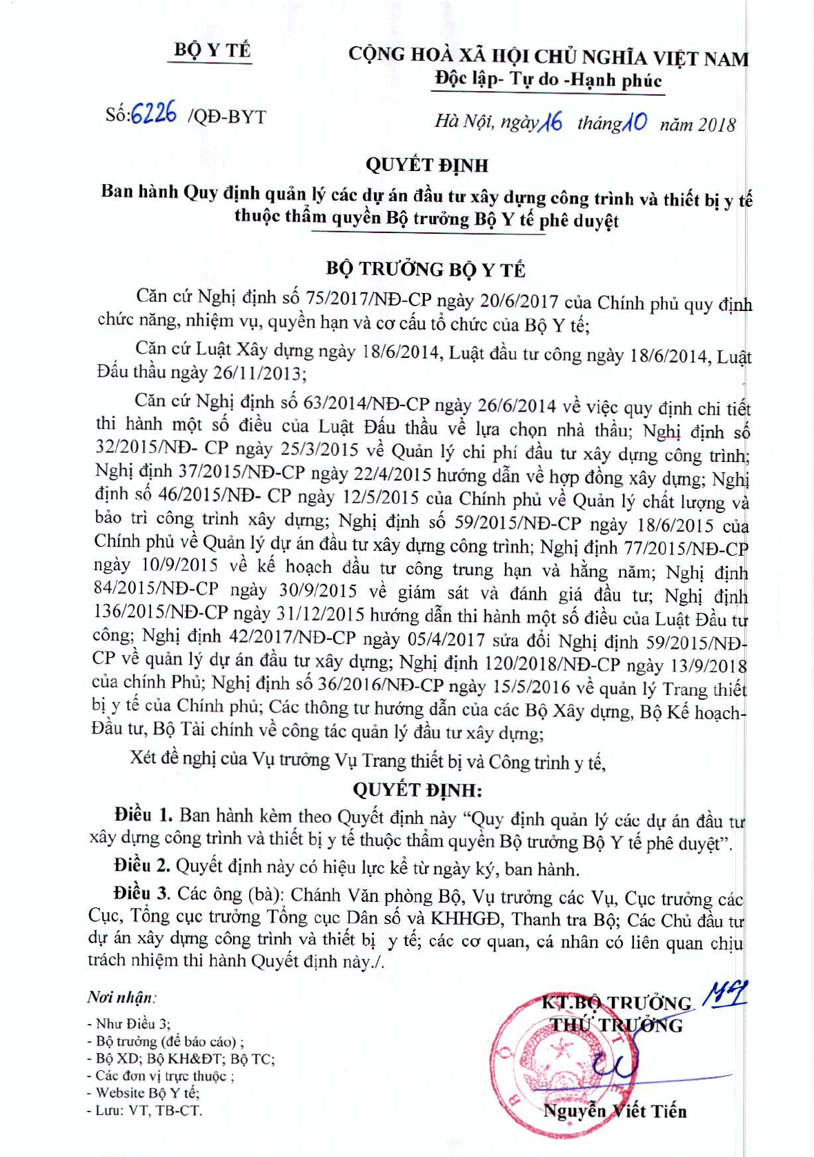Ngày 16/10/2018, Bộ Y tế phê duyệt Quyết định 6226/QĐ-BYT quy định quản lý các dự án đầu tư xây dựng công trình và thiết bị y tế thuộc thẩm quyền của Bộ trưởng Bộ Y tế.