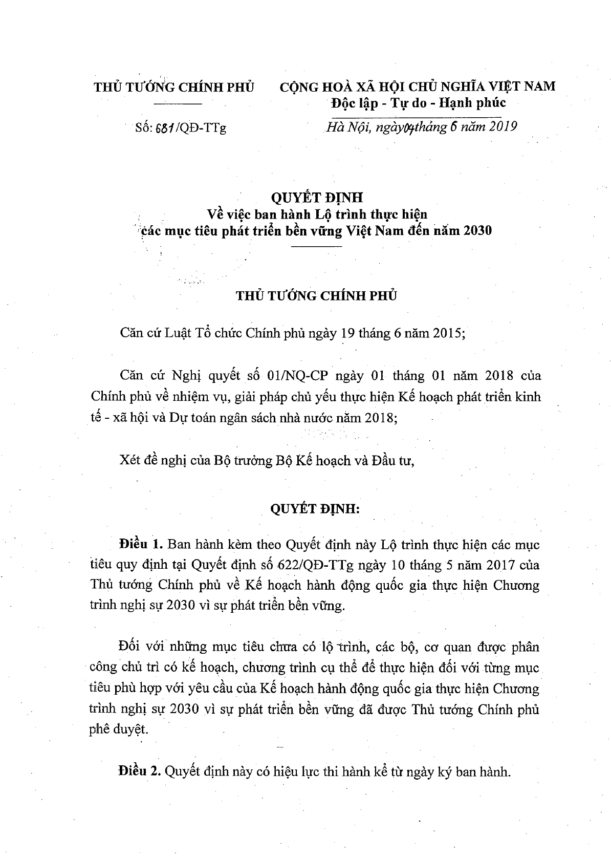 Ngày 04/06/2019, Thủ tướng Chính phủ đã ra Quyết định 681/QĐ-TTg về việc ban hành Lộ trình thực hiện các mục tiêu phát triển bền vững Việt Nam đến năm 2030.