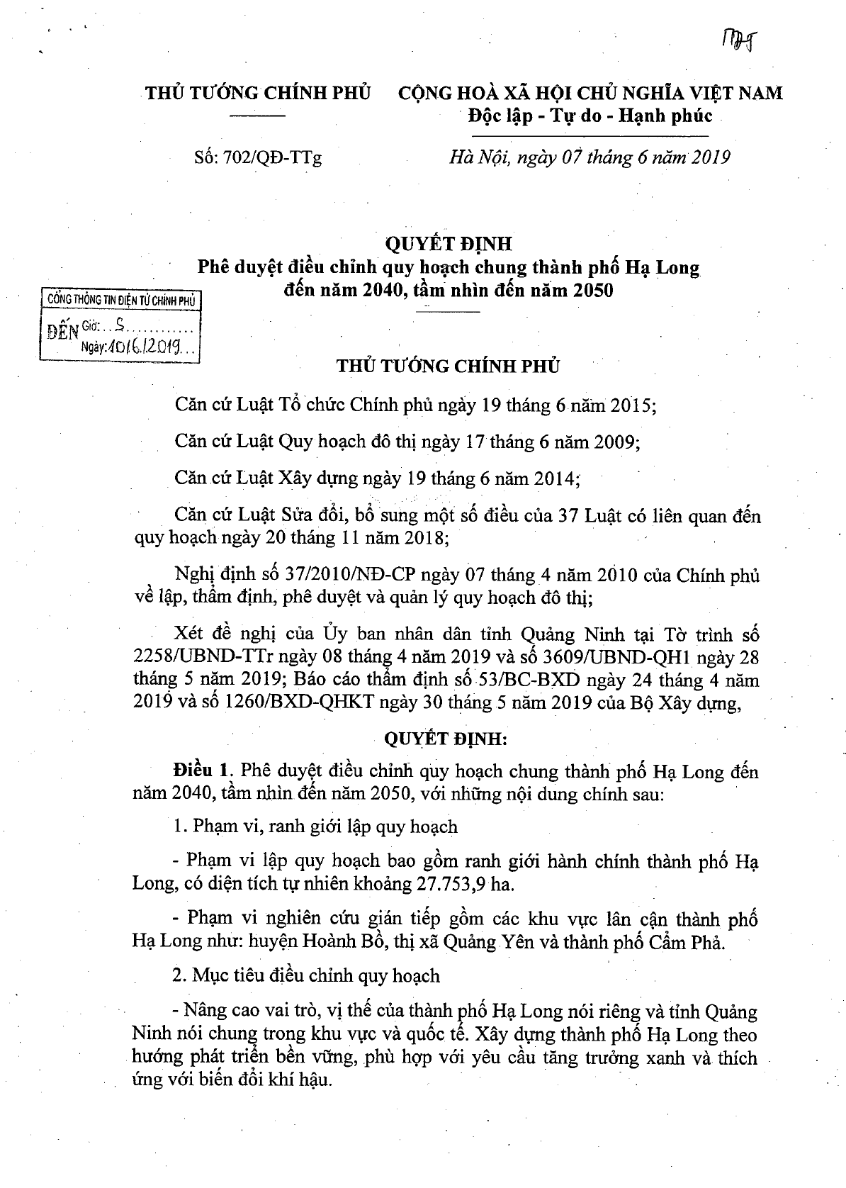 Quyết định 702/QĐ-TTg của Thủ tướng Chính phủ về việc phê duyệt điều chỉnh quy hoạch chung Thành phố Hạ Long đến năm 2040, tầm nhìn đến năm 2050.