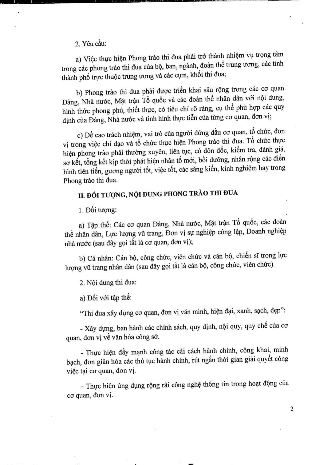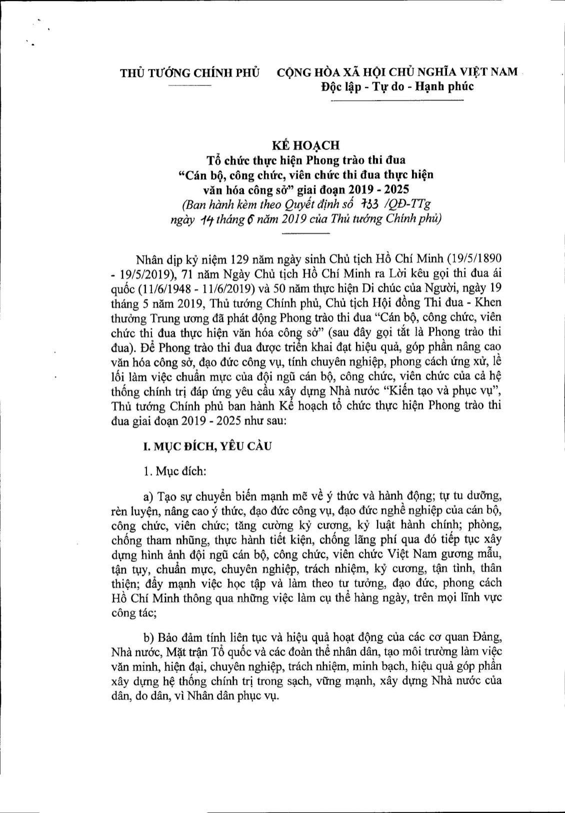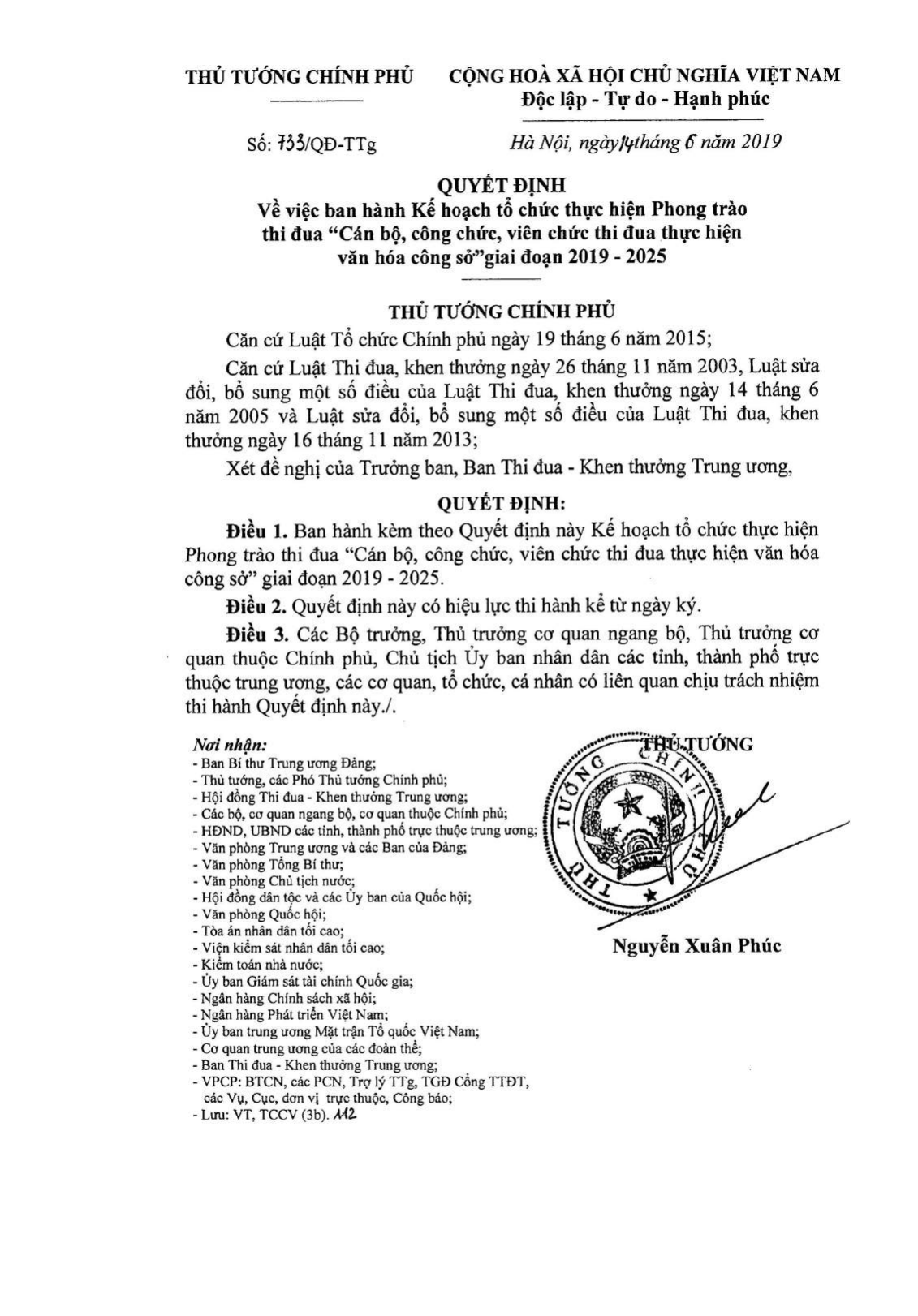 Ngày 14/6/2019, Thủ tướng Chính phủ ra Quyết định 733/QĐ-TTg ban hành Kế hoạch tổ chức thực hiện Phong trào thi đua "Cán bộ, công chức, viên chức thi đua thực hiện văn hóa công sở" giai đoạn 2019-2025.