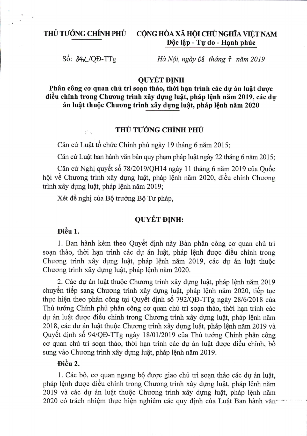 Quyết định 842/QĐ-TTg của Thủ tướng Chính phủ về việc phân công cơ quan chủ trì soạn thảo, thời hạn trình các dự án luật được điều chỉnh trong Chương trình xây dựng luật, pháp lệnh năm 2019, các dự án luật thuộc Chương trình xây dựng luật, pháp lệnh năm 2020.
