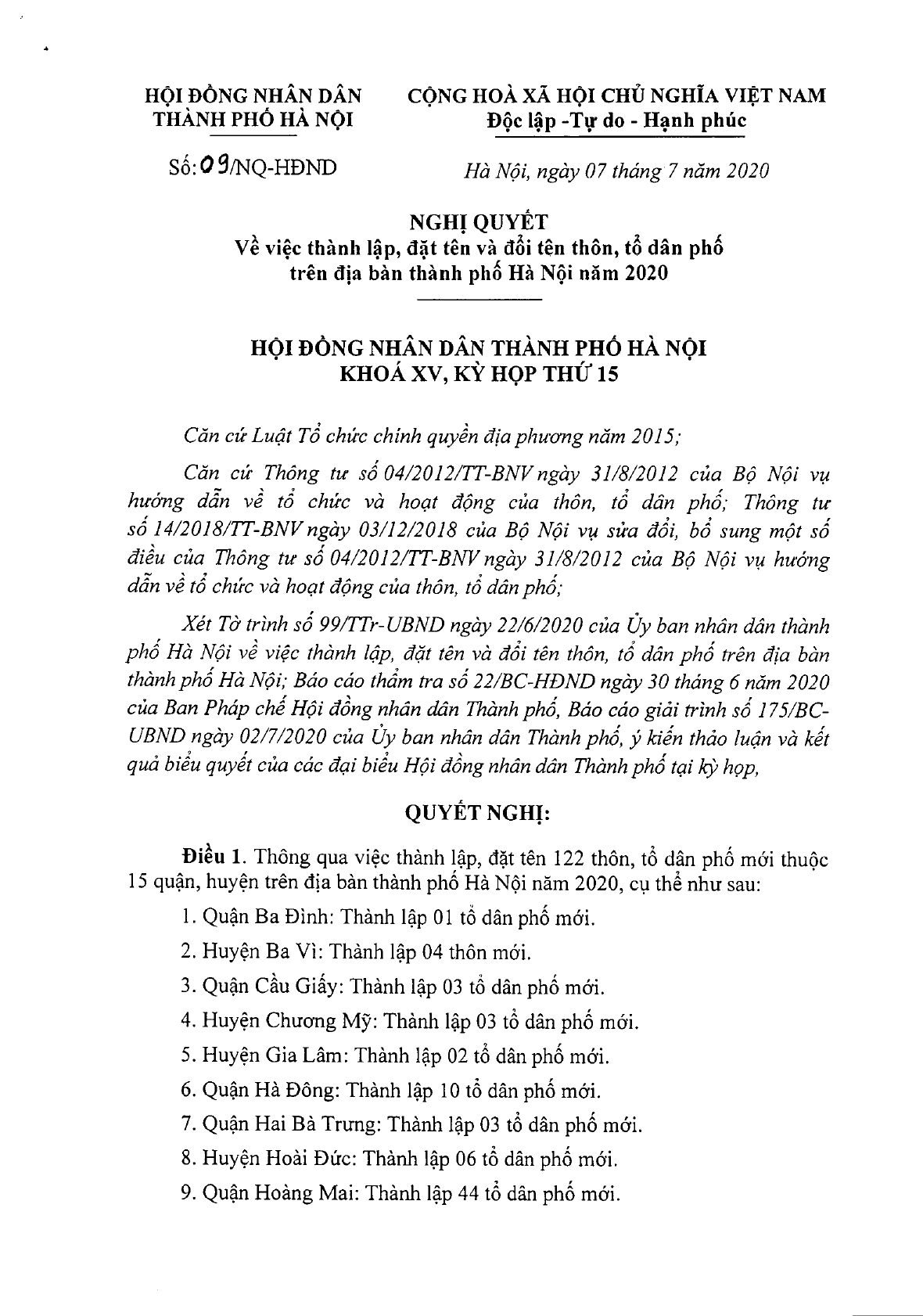 Nghị quyết 09/NQ-HĐND ngày 07/7/2020 của HĐND TP.Hà Nội về việc thành lập, đặt tên và đổi tên thôn, tổ dân phố trên địa bàn năm 2020, trong đó, Thành lập, đặt tên 122 thôn, tổ dân phố mới.