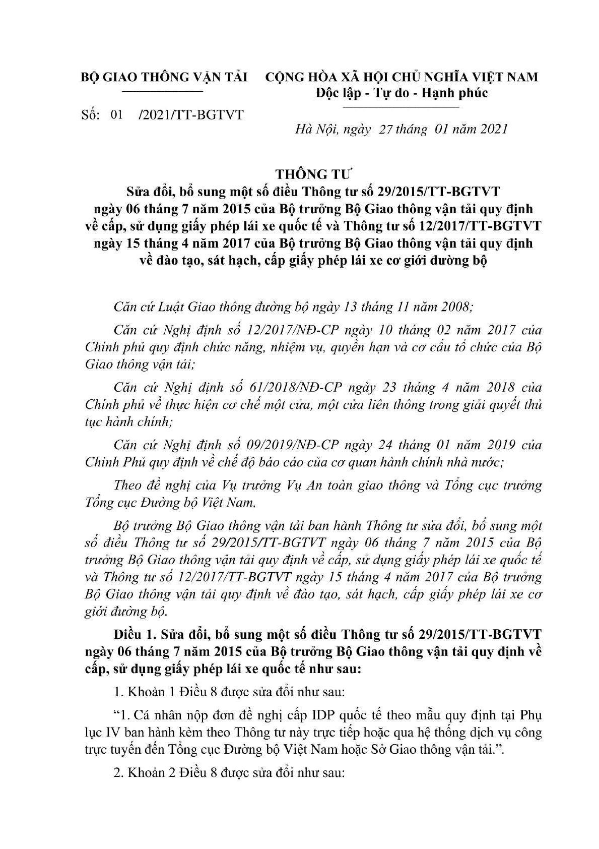 Thông tư 01/2021/TT-BGTVT của Bộ Giao thông Vận tải về việc sửa đổi, bổ sung một số điều Thông tư 29/2015/TT-BGTVT ngày 06/7/2015 của Bộ trưởng Bộ Giao thông Vận tải quy định về cấp, sử dụng giấy phép lái xe quốc tế và Thông tư 12/20