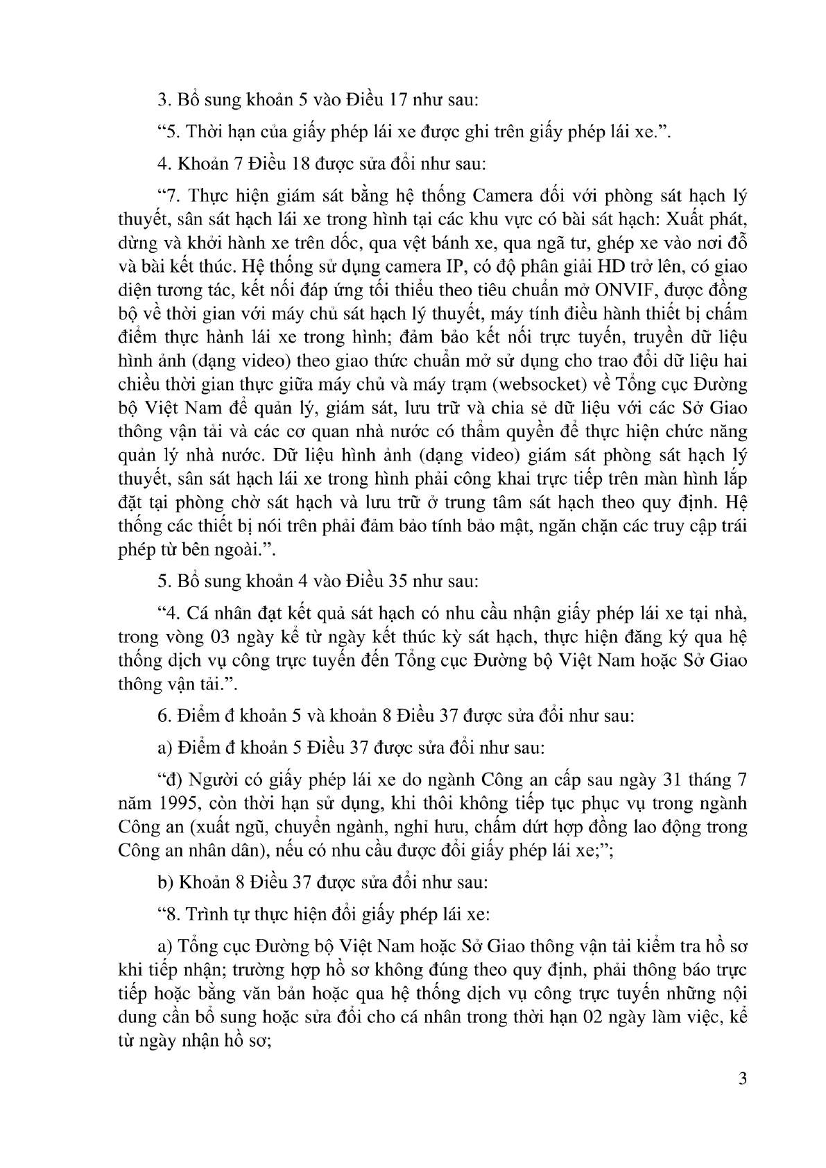 “7. Thực hiện giám sát bằng hệ thống Camera đối với phòng sát hạch lý thuyết, sân sát hạch lái xe trong hình tại các khu vực có bài sát hạch: Xuất phát, dừng và khởi hành xe trên dốc, qua vệt bánh xe, qua ngã tư, ghép xe vào nơi đỗ và bài kết thúc. Hệ thống sử dụng camera IP, có độ phân giải HD trở lên, có giao diện tương tác, kết nối đáp ứng tối thiểu theo tiêu chuẩn mở ONVIF, được đồng bộ về thời gian với máy chủ sát hạch lý thuyết, máy tính điều hành thiết bị chấm điểm thực hành lái xe trong hình; đảm bảo kết nối trực tuyến, truyền dữ liệu hình ảnh (dạng video) theo giao thức chuẩn mở sử dụng cho trao đổi dữ liệu hai chiều thời gian thực giữa máy chủ và máy trạm (websocket) về Tổng cục Đường bộ Việt Nam để quản lý, giám sát, lưu trữ và chia sẻ dữ liệu với các Sở Giao thông vận tải và các cơ quan nhà nước có thẩm quyền để thực hiện chức năng quản lý nhà nước. Dữ liệu hình ảnh (dạng video) giám sát phòng sát hạch lý thuyết, sân sát hạch lái xe trong hình phải công khai trực tiếp trên màn hình lắp đặt tại phòng chờ sát hạch và lưu trữ ở trung tâm sát hạch theo quy định. Hệ thống các thiết bị nói trên phải đảm bảo tính bảo mật, ngăn chặn các truy cập trái phép từ bên ngoài.”.
