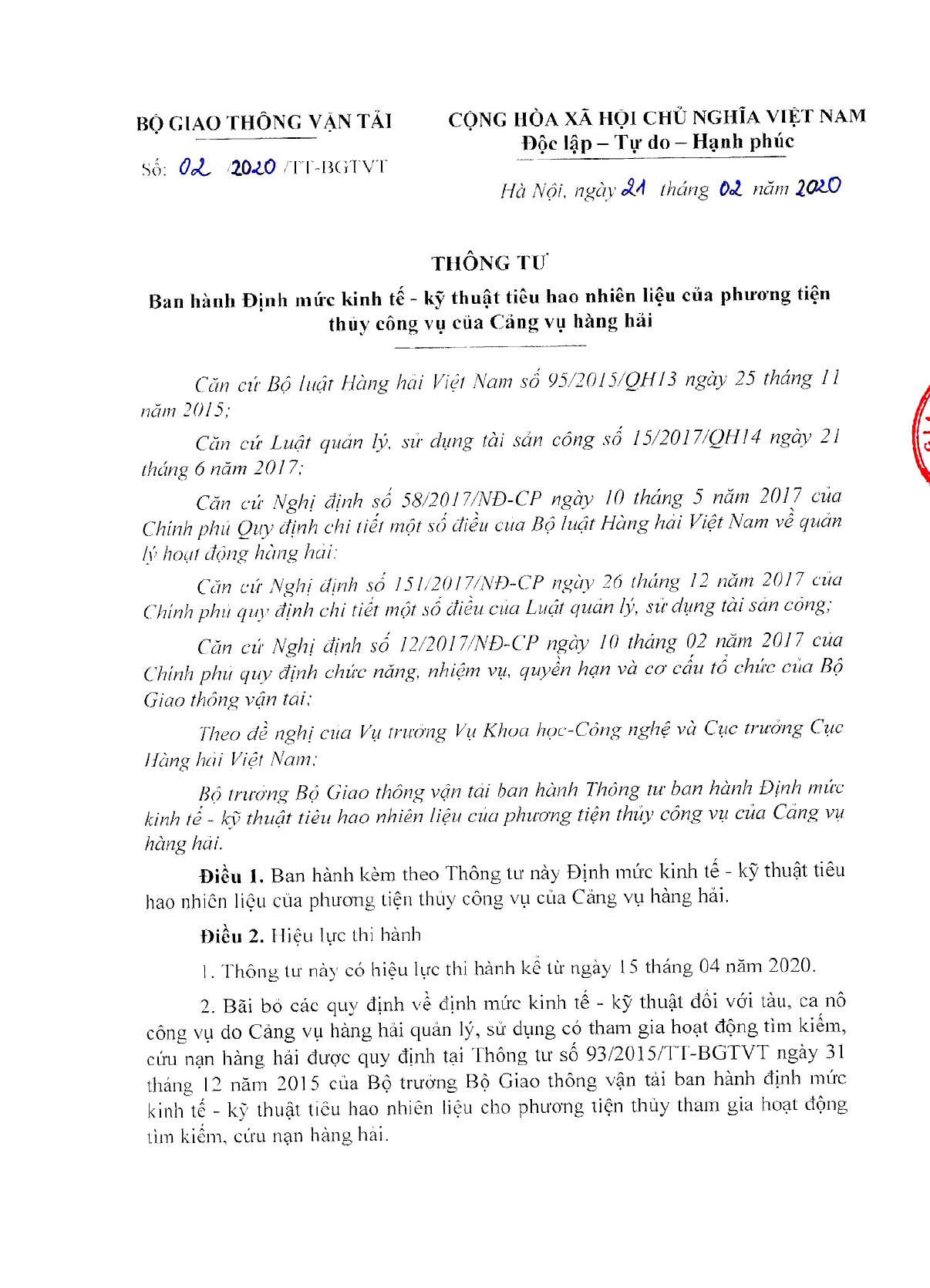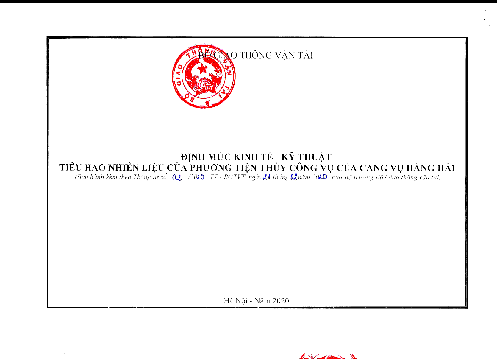 Ngày 21/02/2020, Bộ Giao thông Vận tải ban hành Thông tư 02/2020/TT-BGTVT về việc ban hành Định mức kinh tế - kỹ thuật tiêu hao nhiên liệu của phương tiện thủy công vụ của Cảng vụ hàng hải.
