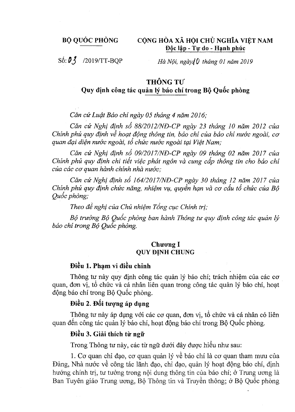 Số hiệu văn bản 03/2019/TT-BQP