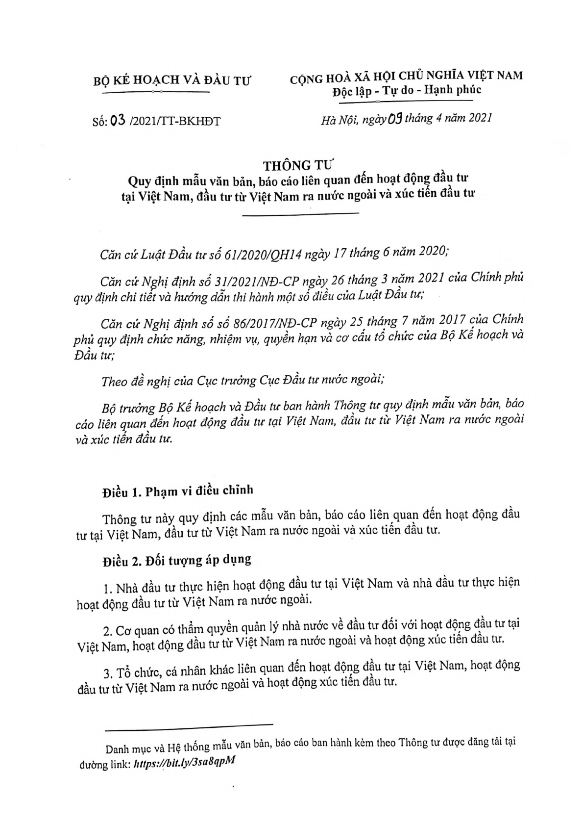 Ngày 09/4/2021, Bộ KH&ĐT ban hành Thông tư 03/2021/TT-BKHĐT quy định mẫu văn bản, báo cáo liên quan đến hoạt động đầu tư tại Việt Nam, đầu tư từ Việt Nam ra nước ngoài và xúc tiến đầu tư.